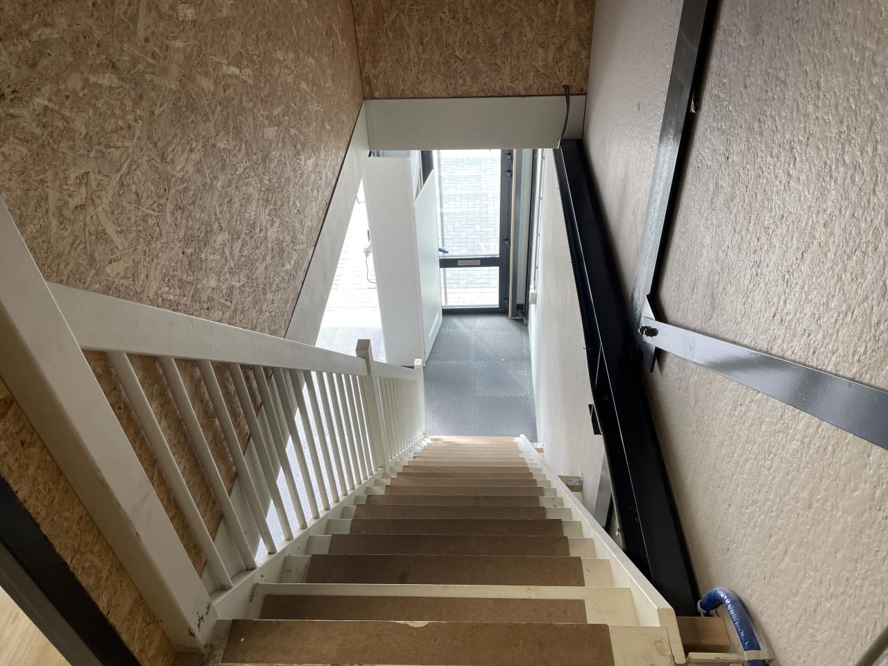- Houten trap naar de verdieping (trapgat afgetimmerd);