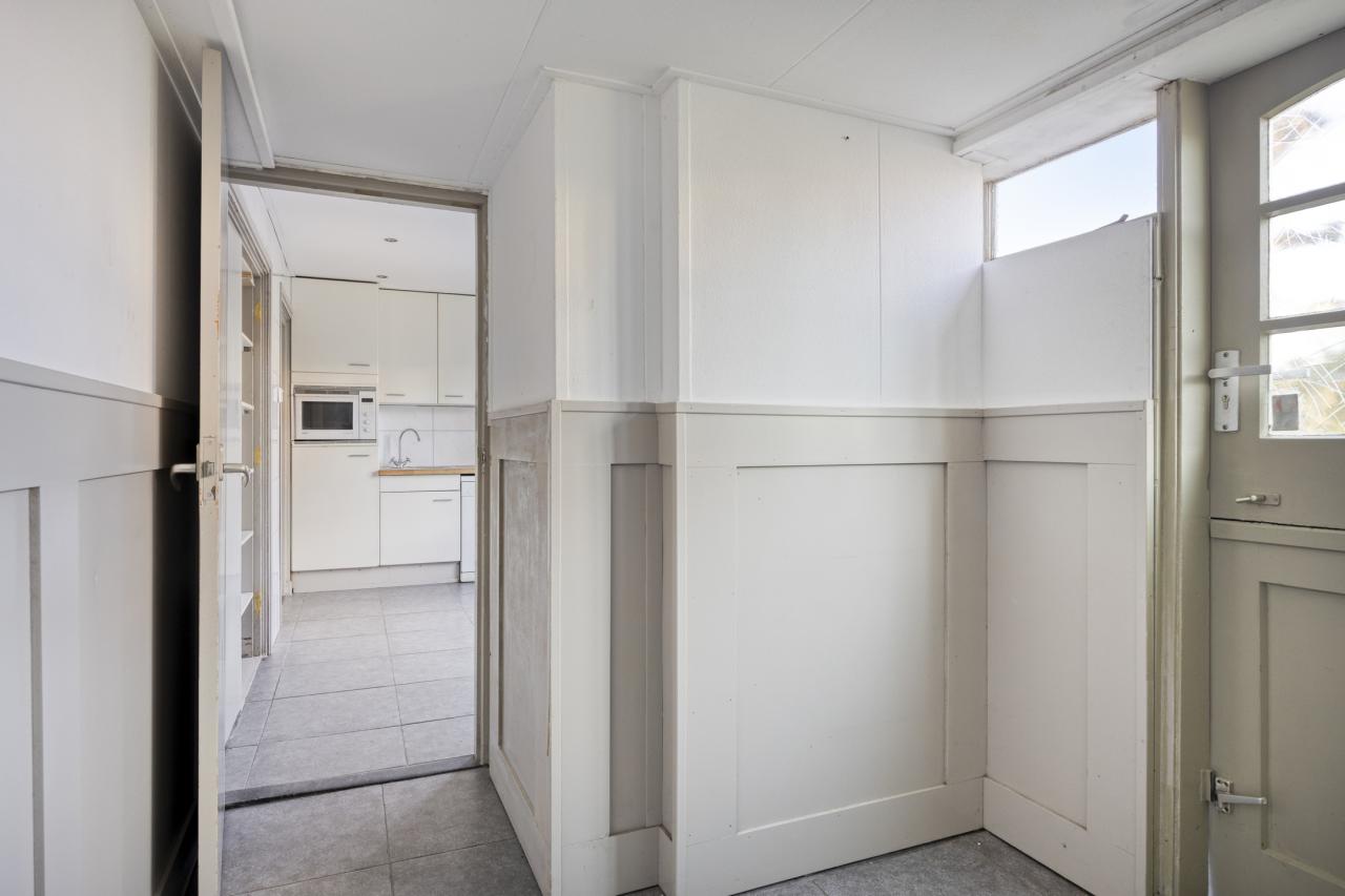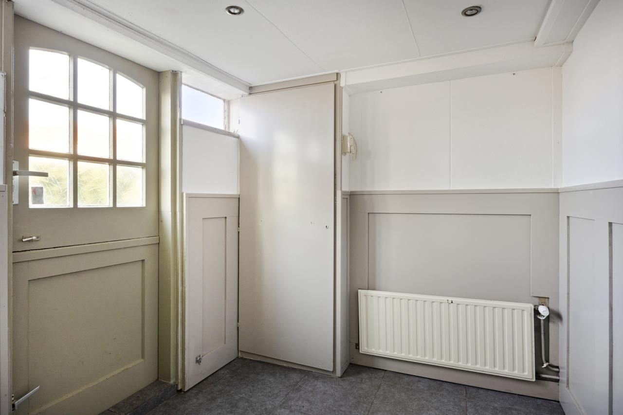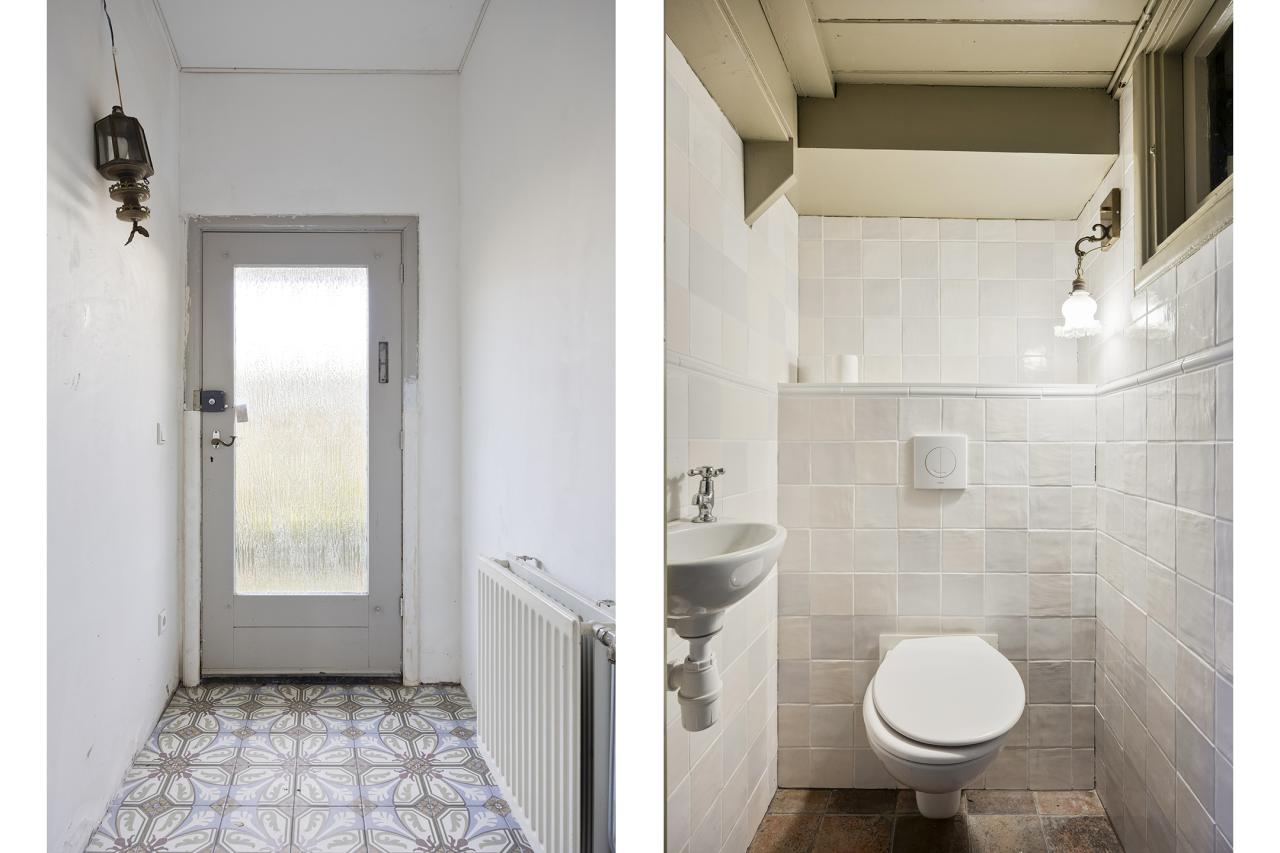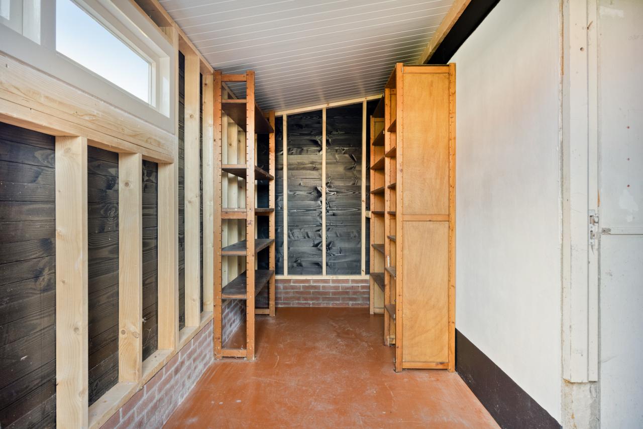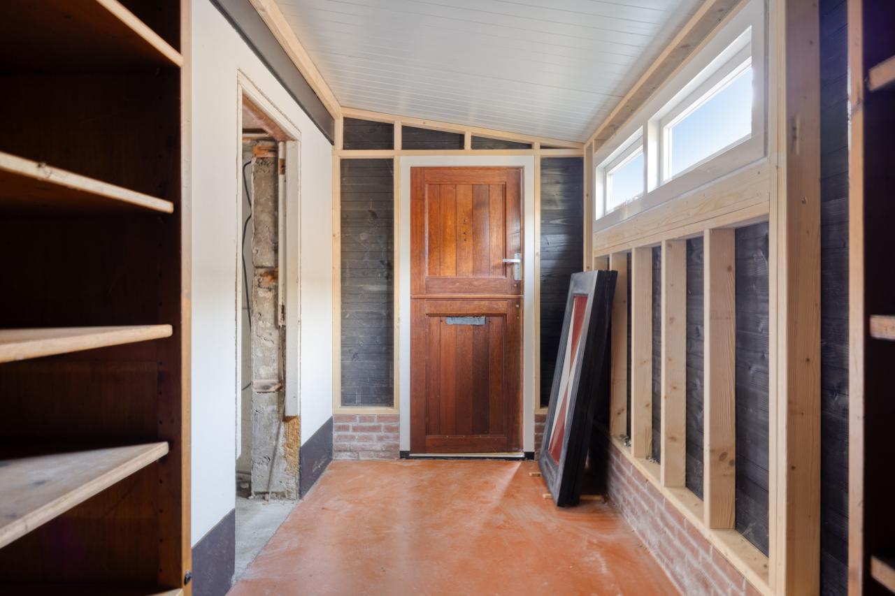 Aan de achterzijde ligt de oorspronkelijke hal met voordeur, die eventueel bij de woonkamer kan worden betrokken. Aansluitend bevindt zich een slaapkamer op de begane grond, met grote raampartijen en uitzicht op de achterzijde. Aan de linkerachterzijde is de bijkeuken gesitueerd met wasmachine en wasdroger aansluiting en er is een mogelijkheid om een douche te realiseren.