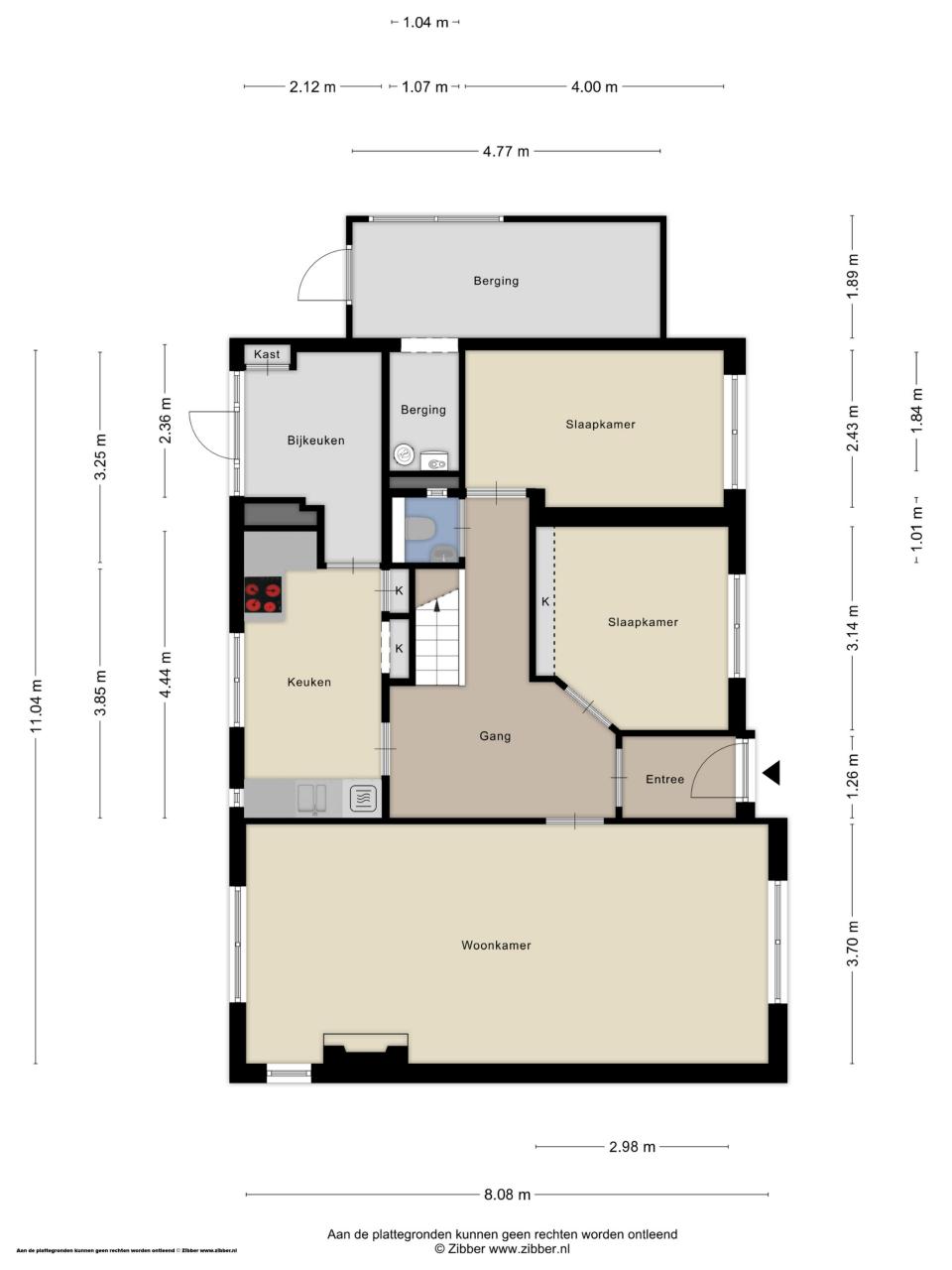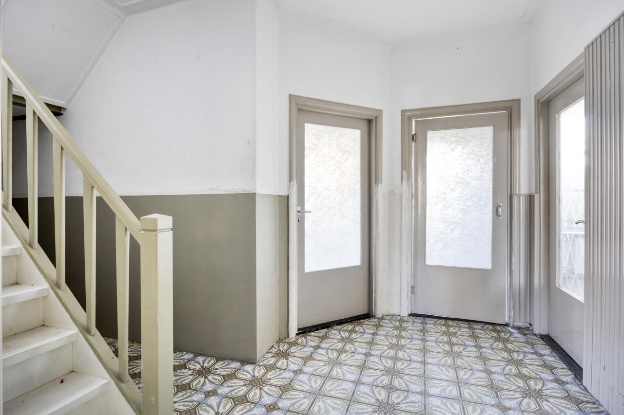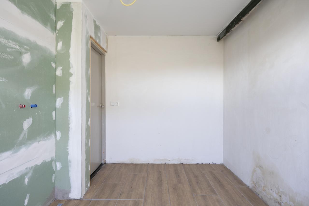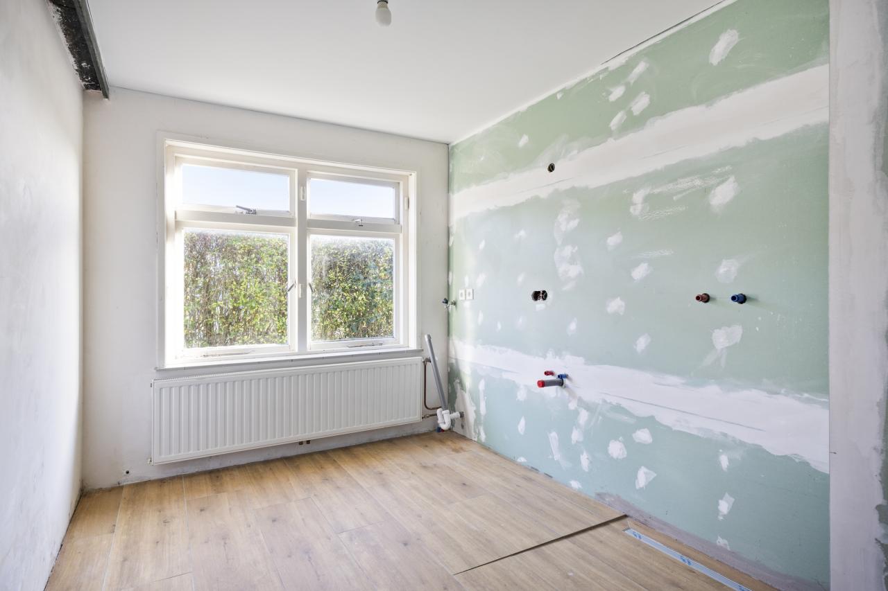 Aan de achterzijde ligt de oorspronkelijke hal met voordeur, die eventueel bij de woonkamer kan worden betrokken. Aansluitend bevindt zich een slaapkamer op de begane grond, met grote raampartijen en uitzicht op de achterzijde. Aan de linkerachterzijde is de bijkeuken gesitueerd met wasmachine en wasdroger aansluiting en er is een mogelijkheid om een douche te realiseren.