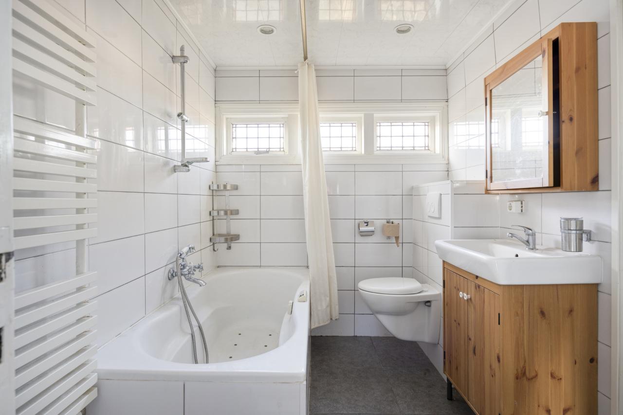 De eerste verdieping is bereikbaar via de vaste trap in de centrale hal. Hier zijn drie slaapkamers en een badkamer aanwezig. Aan de linkerzijde ligt een compacte éénpersoonskamer met dakkapel. De twee grotere slaapkamers aan de achterzijde beschikken beide over inbouwkasten. De badkamer is ingericht met een ligbad met douchefunctie, wastafel en inbouwkast.