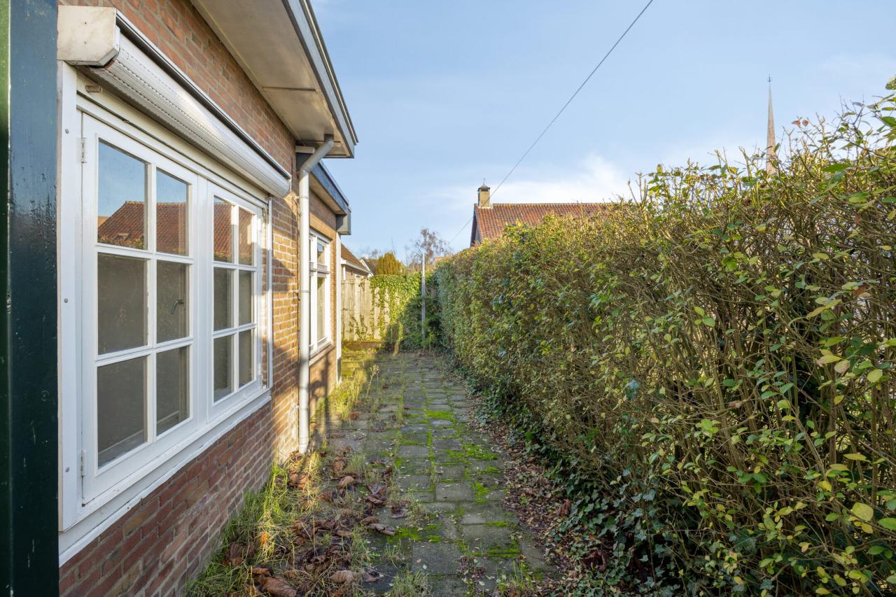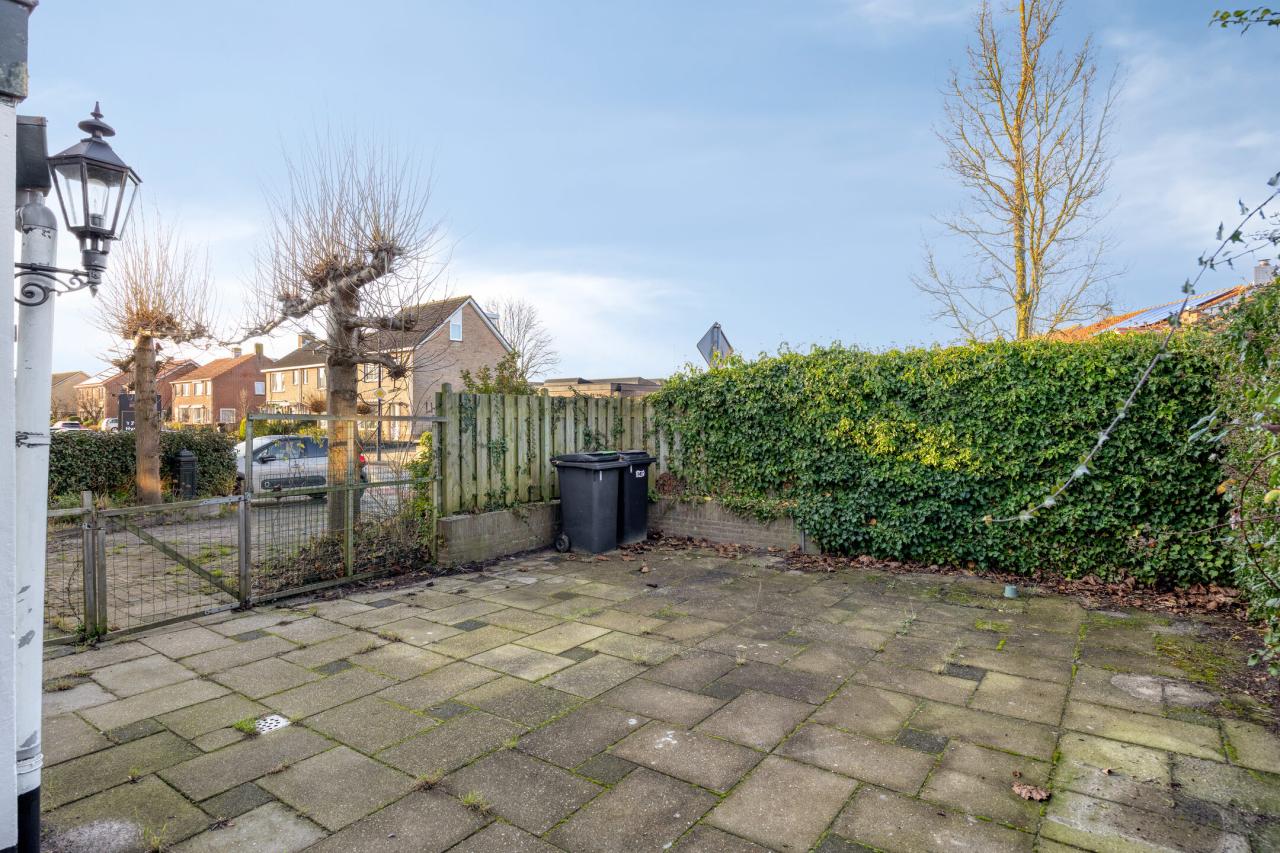 De voortuin, gelegen op het zuidoosten, fungeert als hoofdtuin en is deels afgeschermd met een groene haag en schutting. Achter de woning bevindt zich nog een bestraat terras, perfect om fietsen te stallen of een tweede zitplek te creëren. De tuin is grotendeels onderhoudsvriendelijk aangelegd met tegels. Aan de zijkant van de woning staat een ruime houten schuur voorzien van water en elektra, ideaal als werkruimte of extra bergruimte.
