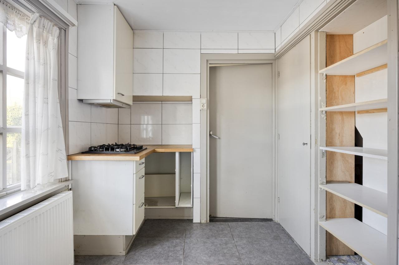 U betreedt de woning officieel via de hal aan de achterzijde of via de bijkeuken aan de voorzijde. Vanuit beide entrees hier heeft u toegang tot de gesloten keuken, die is voorzien van een koelkast, vaatwasmachine, magnetron, gasfornuis en afzuigkap. De keuken beschikt over een handige trapkast en geeft toegang tot de centrale hal.