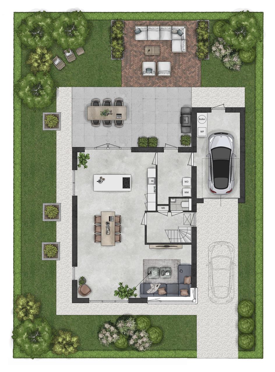 Ruimte en licht zijn hier de eerste woorden die te binnen schieten. Er zijn veel en grote ramen toegepast die overal voor doorkijkjes naar buiten en voor veel daglichttoetreding zorgen. Voor deze woning kan een zithoek van formaat uitgekozen worden, die zal hier met gemak passen, net als een grote eettafel.