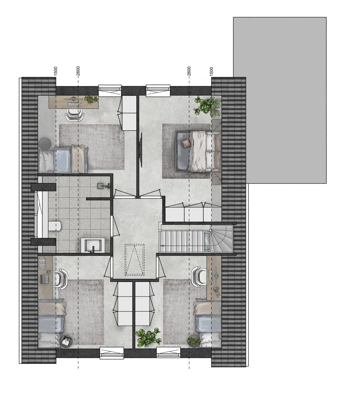 Op de verdieping zijn 4 slaapkamers van ca. 11m², 11,5m² en 14,5m² groot. De badkamer is voorzien van een douche, toilet en wastafelmeubel. Bij bouwnummer 1 is de badkamer voorzien van een dakkapel. Voor de badkamer en het gastentoilet is een sanitair- en tegelpakket samengesteld dat onderdeel is van de koopsom.