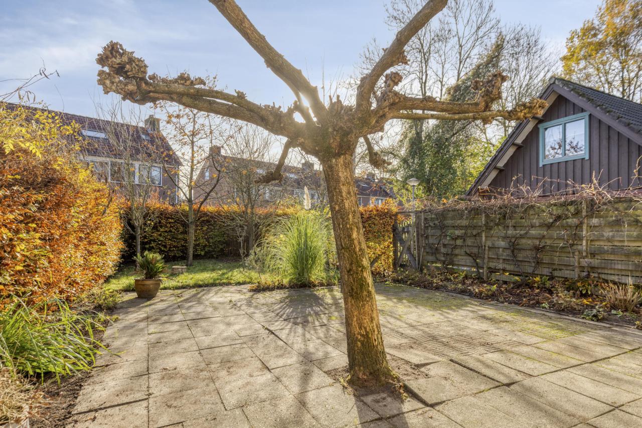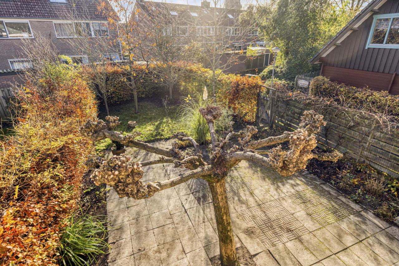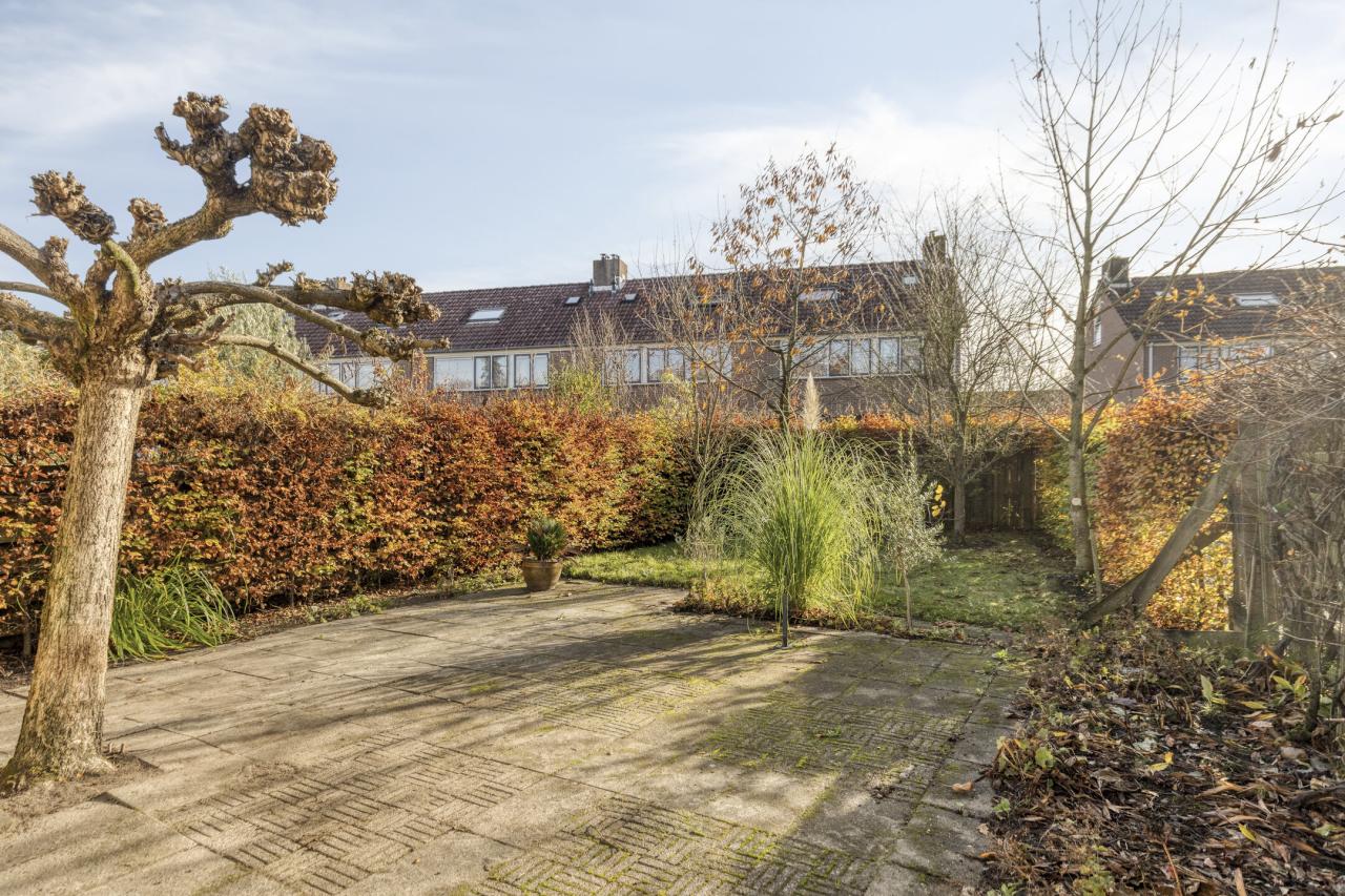 De achtertuin biedt veel privacy en is omsloten met schuttingen. Naast de woning bevindt zich de garage.