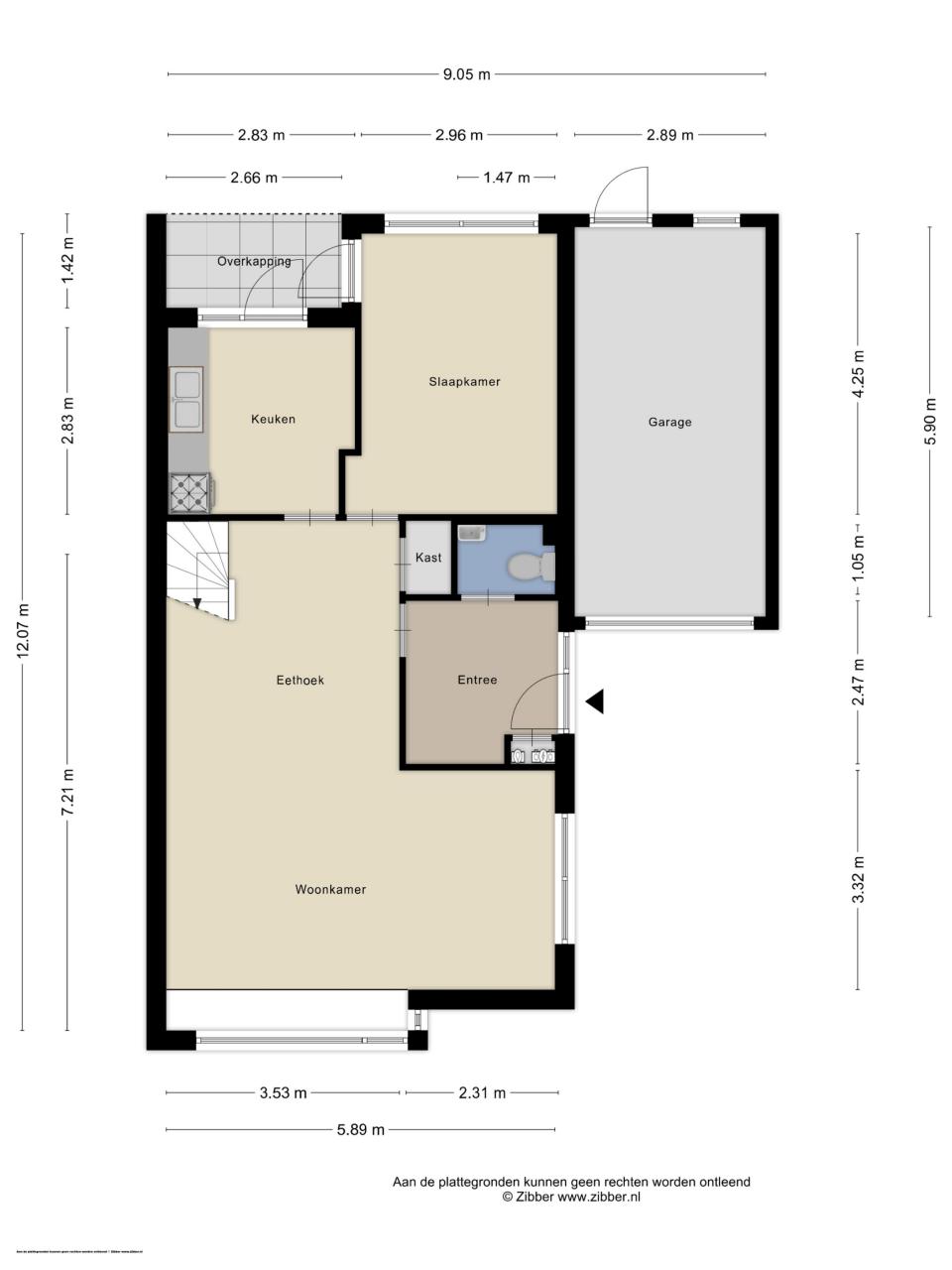 Entree met hal, meterkast en toilet. Ruime woonkamer met zitgedeelte aan de voorzijde en eetgedeelte bij de gesloten keuken. Vanuit de keuken is er toegang tot de tuin en de garage. Aan de achterzijde bevindt zich een extra kamer die bij de keuken kan worden getrokken maar ook ideaal is als slaapkamer, werkkamer of speelruimte.