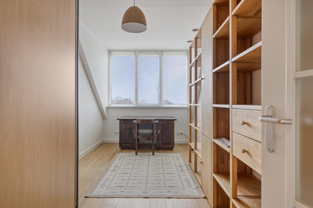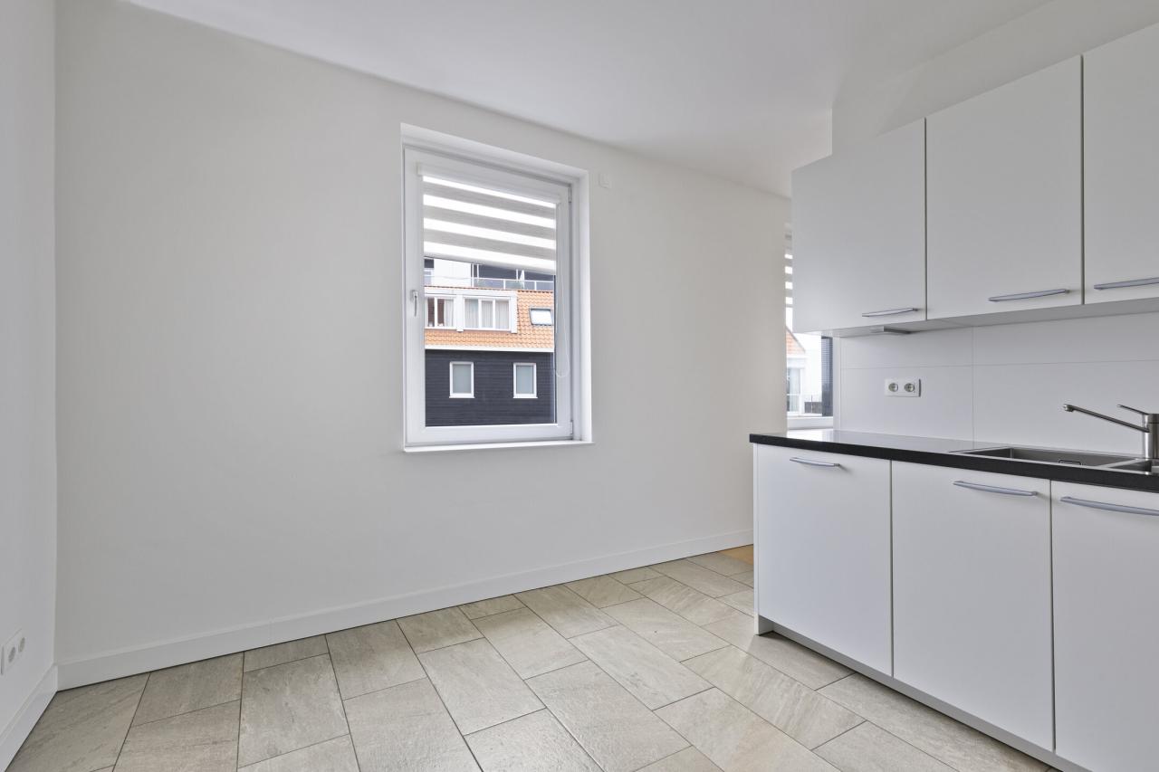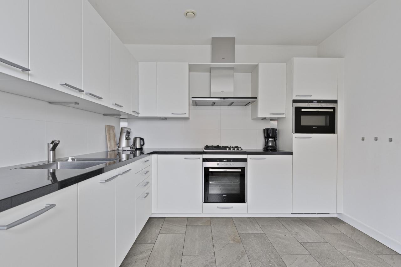 De royale woonkamer heeft een oppervlakte van circa 45 m² en beschikt over een balkon met glazen wand, waardoor dit een verlengstuk vormt van de woonruimte. De grote raampartijen zorgen voor opvallend veel lichtinval. De halfopen keuken verkeert in een goede staat van onderhoud en is voorzien van een gaskookplaat, afzuigkap, oven, magnetron, koelkast, vriezer en een nieuwe vaatwasser.