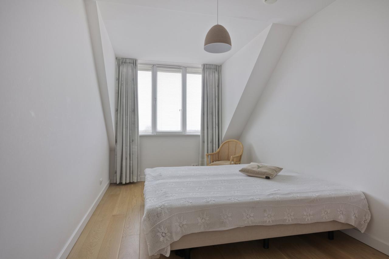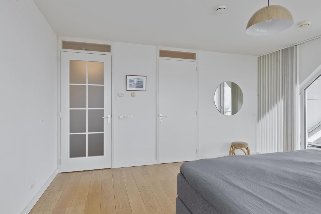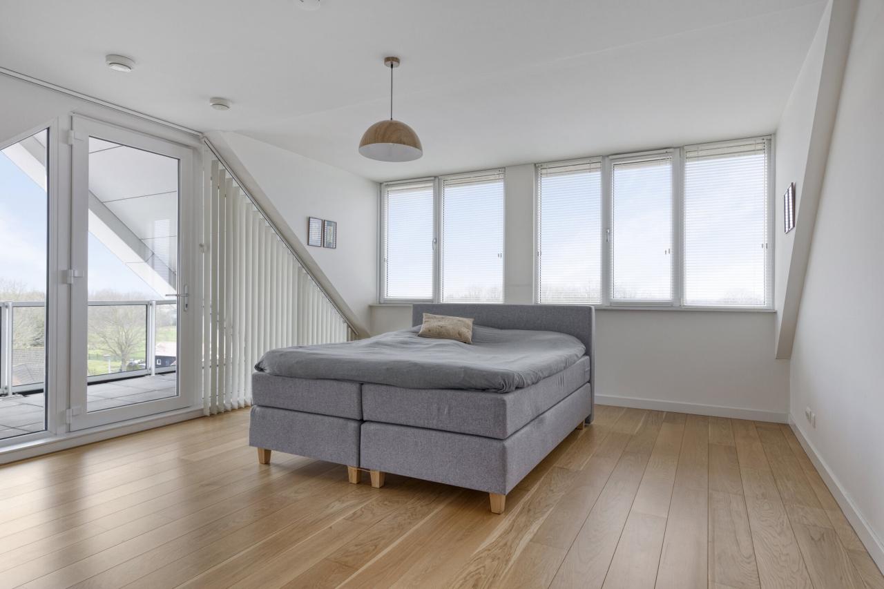 De hoofdslaapkamer is gelegen aan de voorzijde van het appartement, heeft een oppervlakte van circa 22 m² en beschikt over een deur naar de loggia (overdekt balkon). Aangrenzend bevindt zich een luxe badkamer met wastafelmeubel, inloopdouche en toilet.