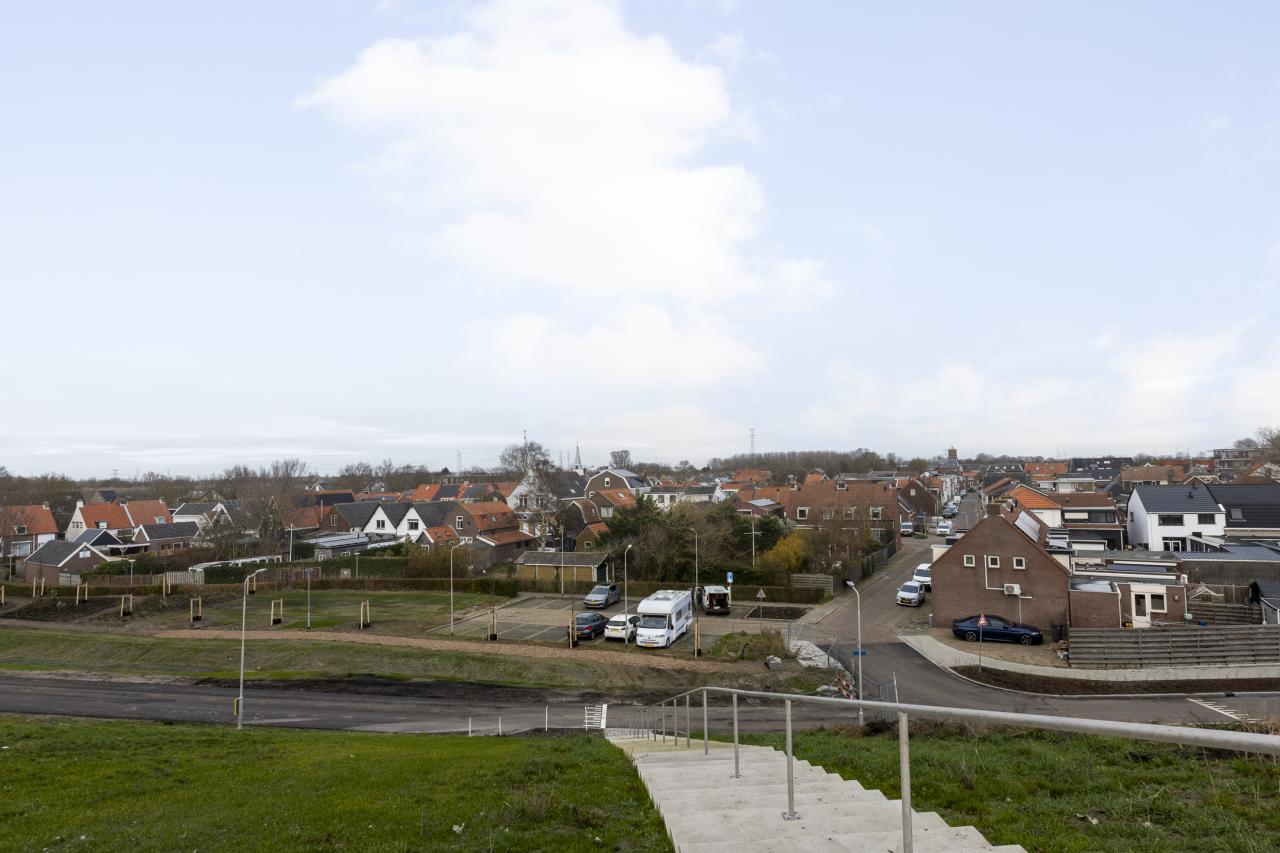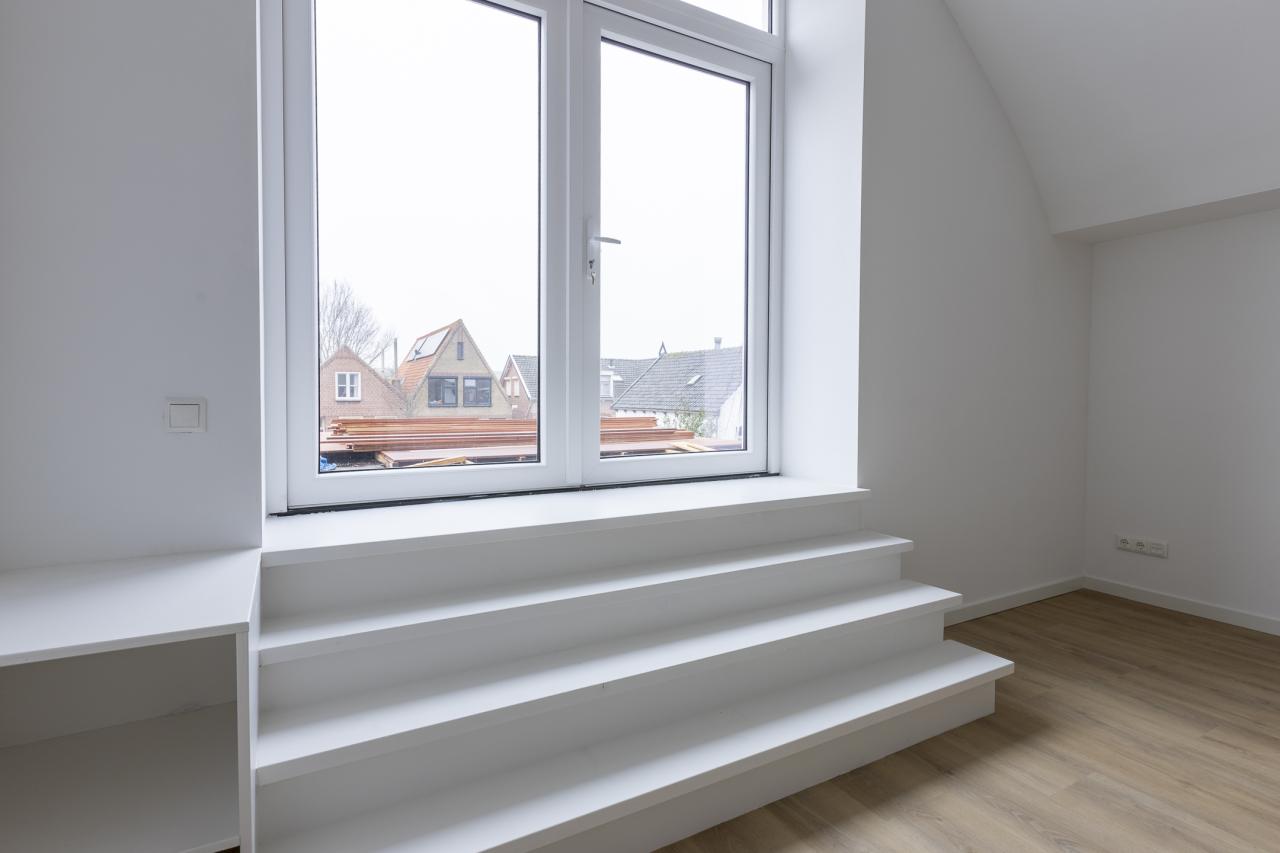 Aan de zijkant van het gebouw bevindt zich de gezamenlijke entree met toegang tot de appartementen. De indeling van dit appartement is verrassend: de slaapkamers en badkamer bevinden zich op de begane grond, terwijl de woonkamer en keuken op de verdieping zijn gesitueerd. Hierdoor geniet je van een fraai uitzicht en optimaal gebruik van het ruime dakterras.