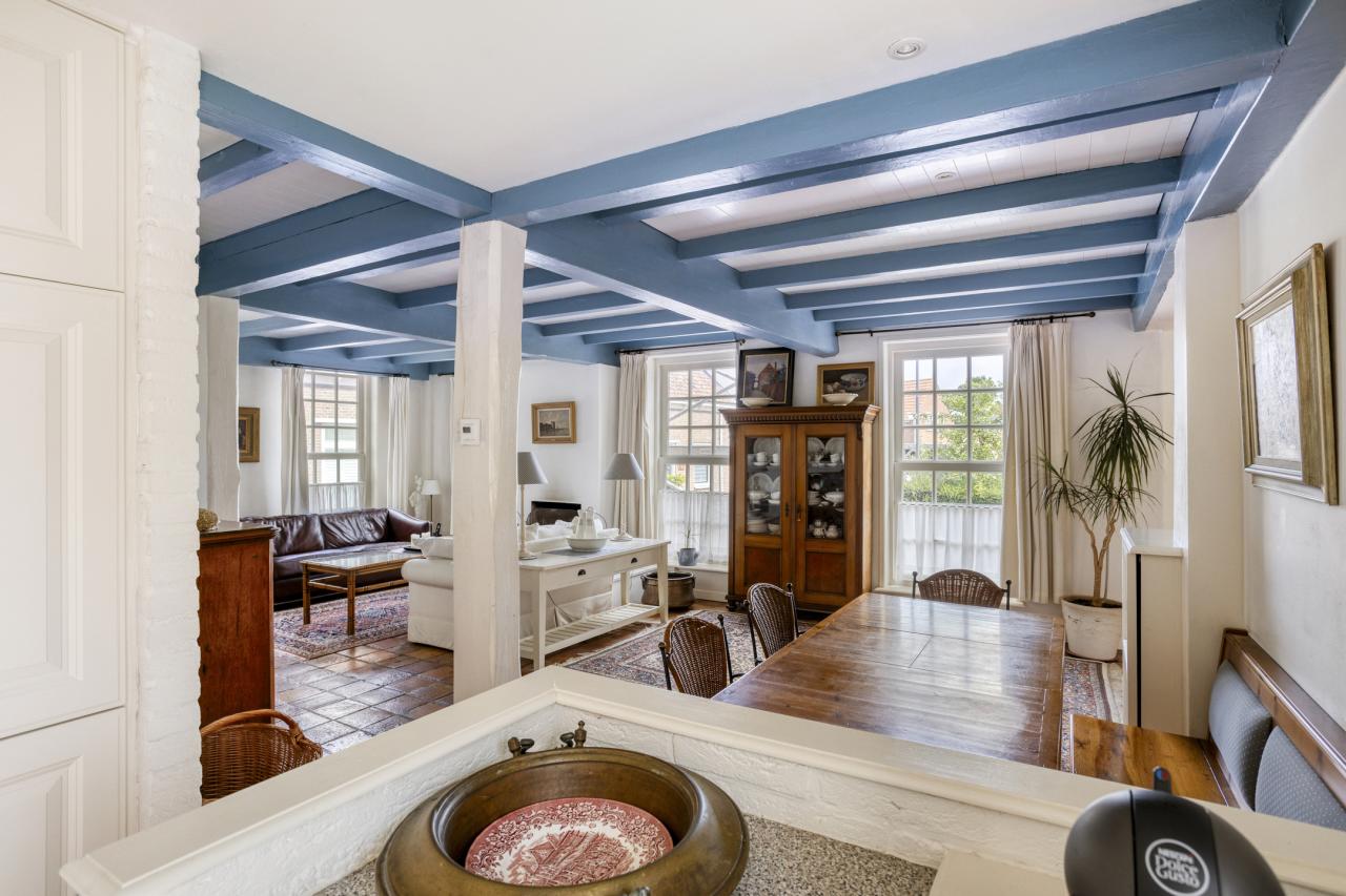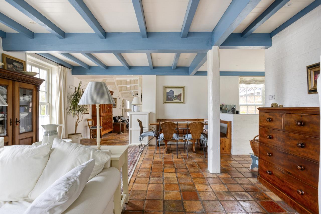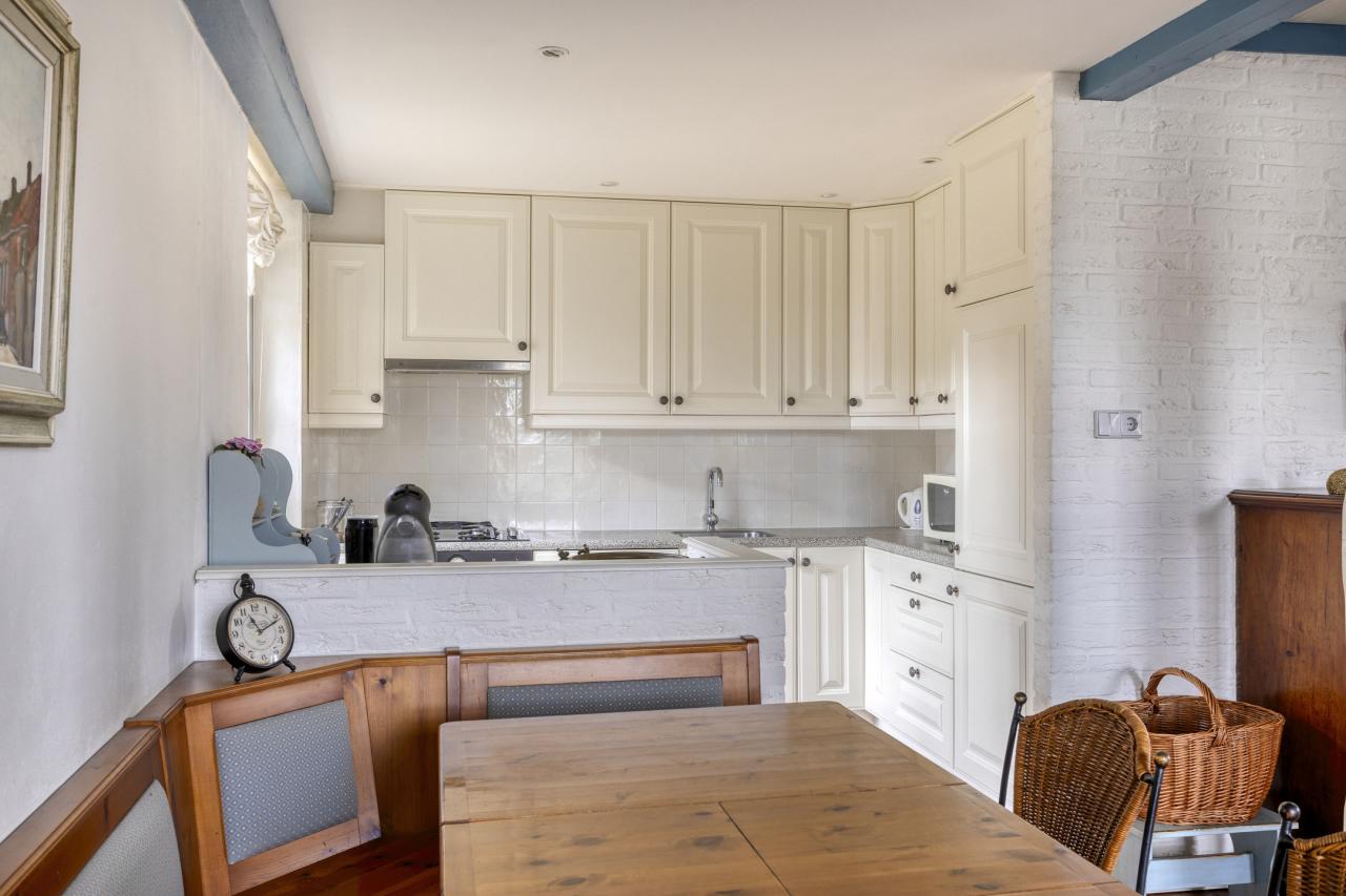De woonkamer aan de voorzijde staat in open verbinding met de keuken en biedt ruimte aan een royale zithoek en eethoek. De balkenplafonds en plavuizenvloer zorgen voor een authentieke, gezellige uitstraling. Vanuit de keuken heeft u zicht op de achtertuin. De keuken is eenvoudig maar functioneel en uitgerust met een gaskookplaat, oven, afzuigkap, koelkast, vriezer en vaatwasser.