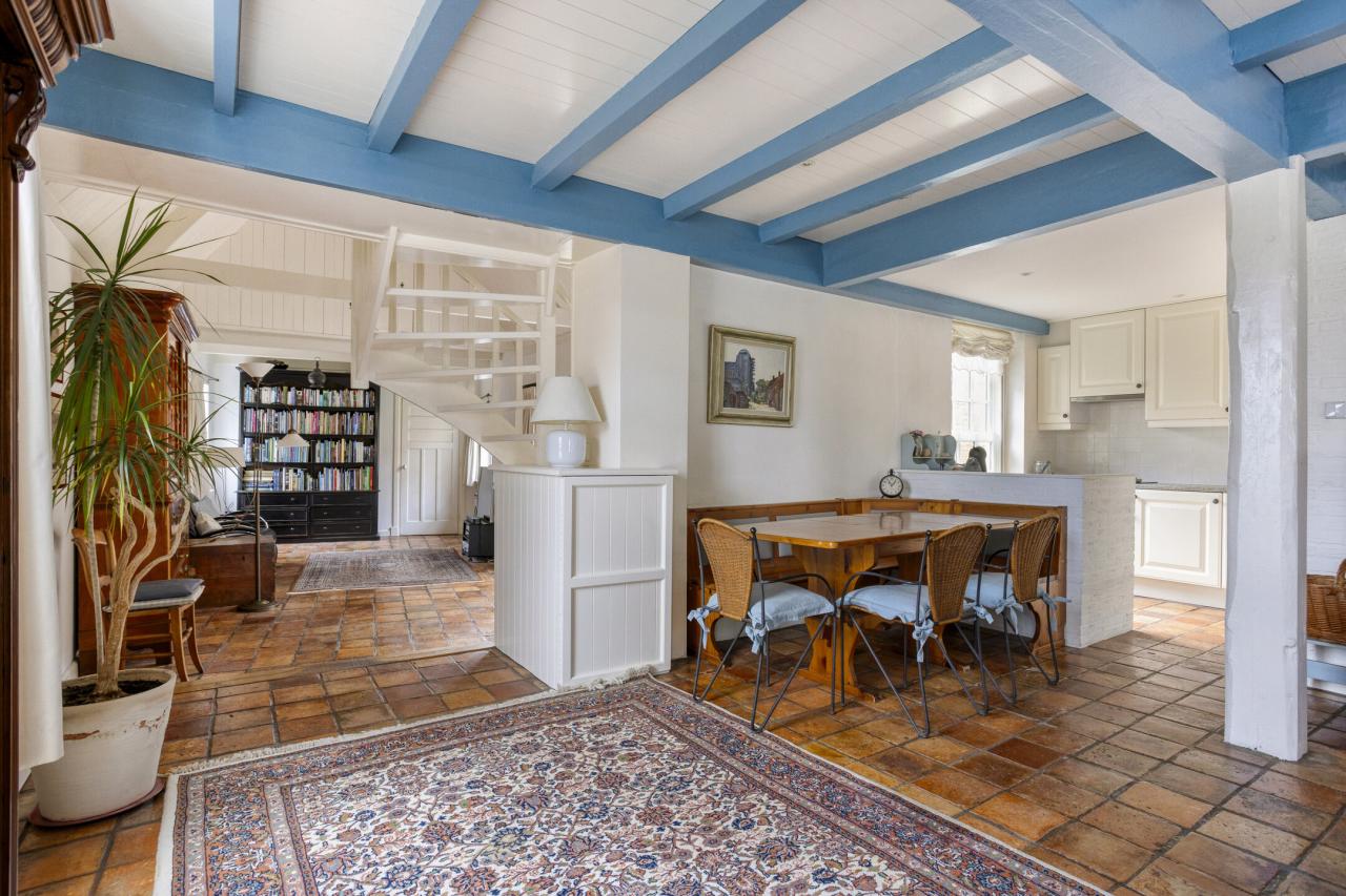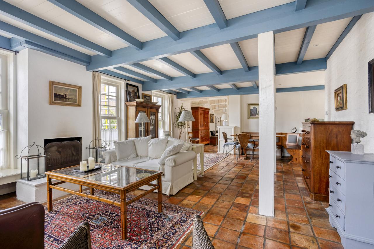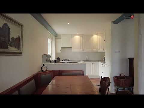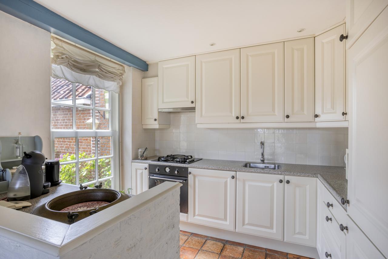 De woonkamer aan de voorzijde staat in open verbinding met de keuken en biedt ruimte aan een royale zithoek en eethoek. De balkenplafonds en plavuizenvloer zorgen voor een authentieke, gezellige uitstraling. Vanuit de keuken heeft u zicht op de achtertuin. De keuken is eenvoudig maar functioneel en uitgerust met een gaskookplaat, oven, afzuigkap, koelkast, vriezer en vaatwasser.