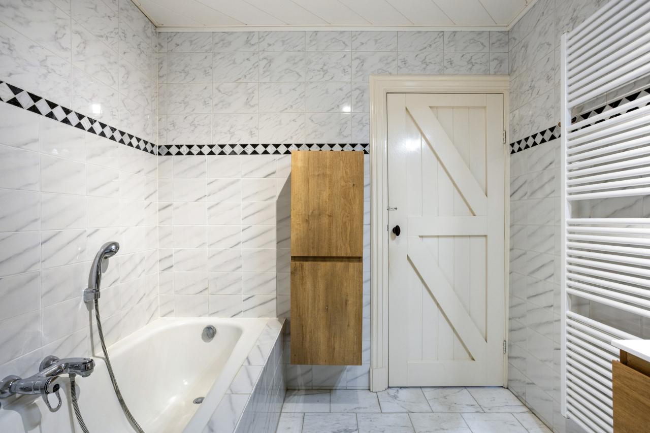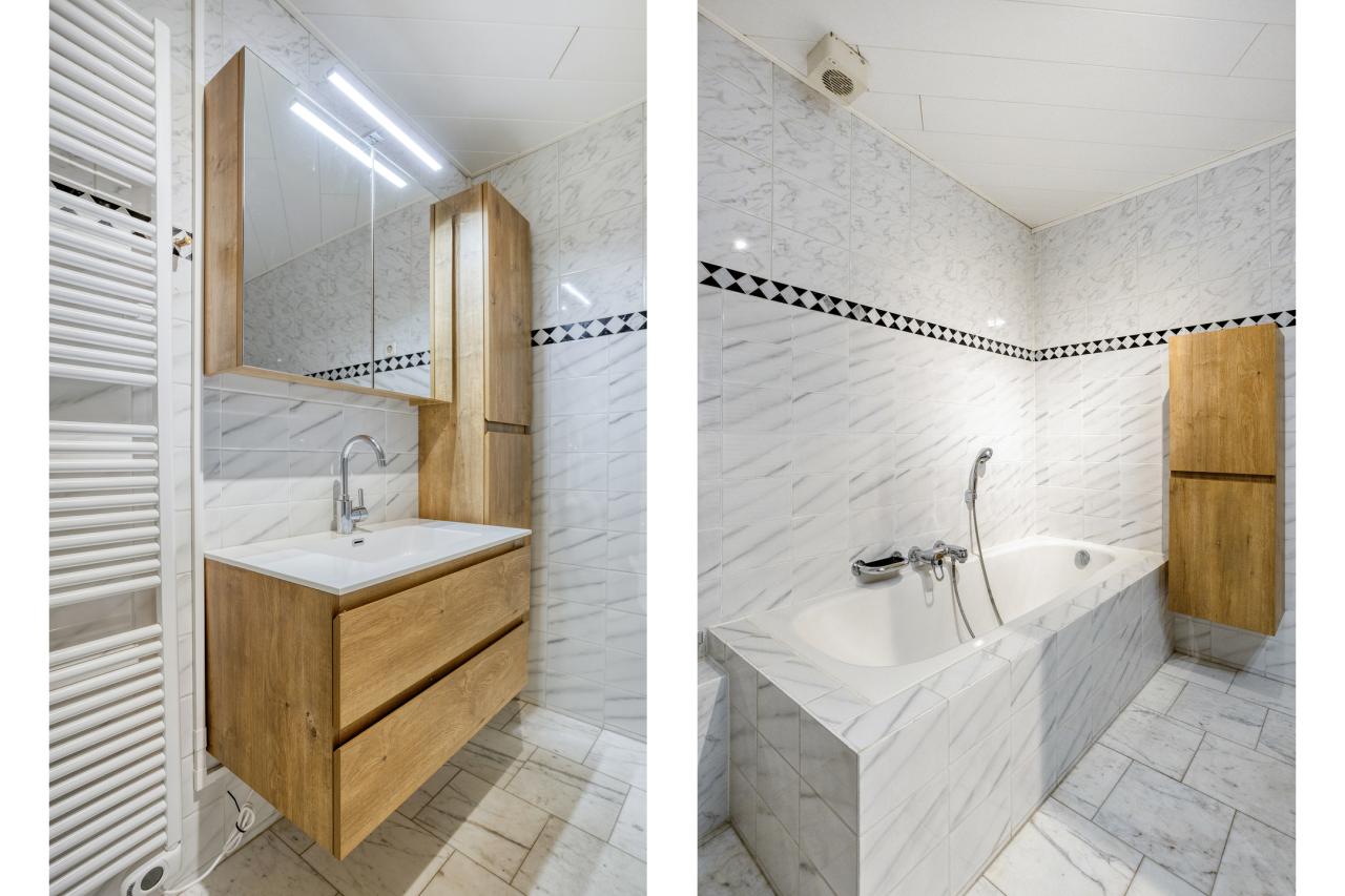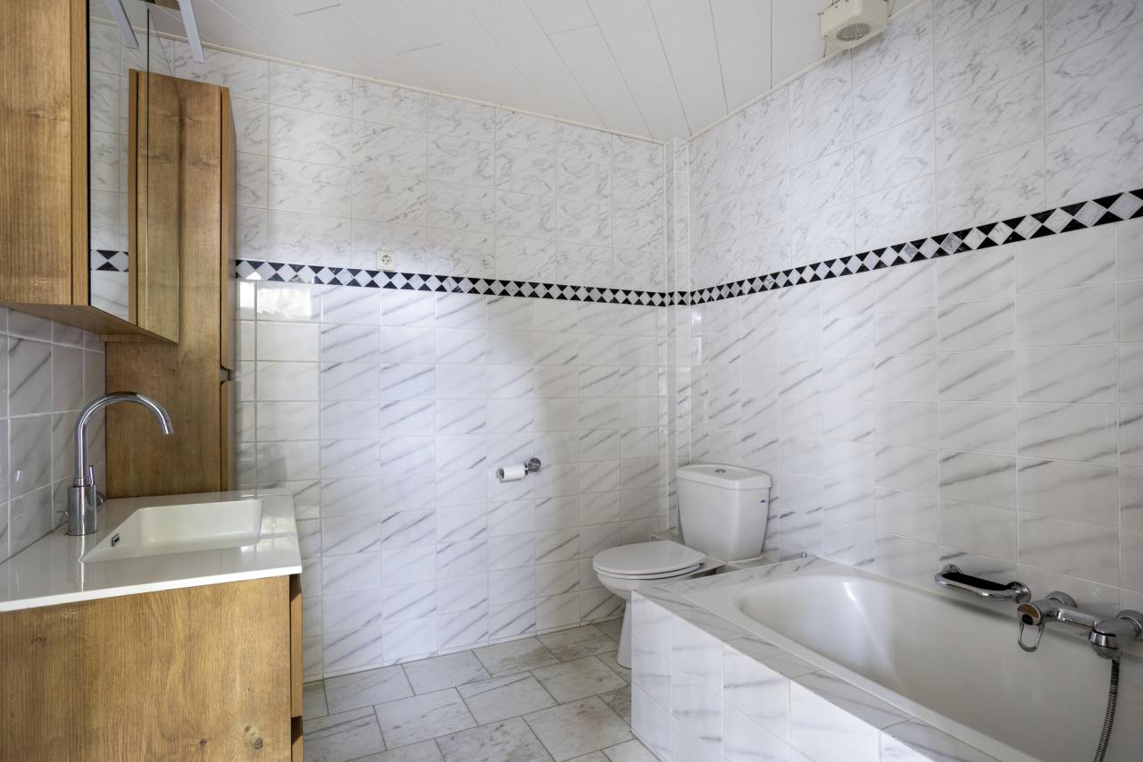 Achter de fraaie voordeur bevindt zich de hal met meterkast en toegang tot de badkamer en woonkamer. De badkamer is voorzien van een wastafelmeubel met kolomkast, ligbad en toilet.