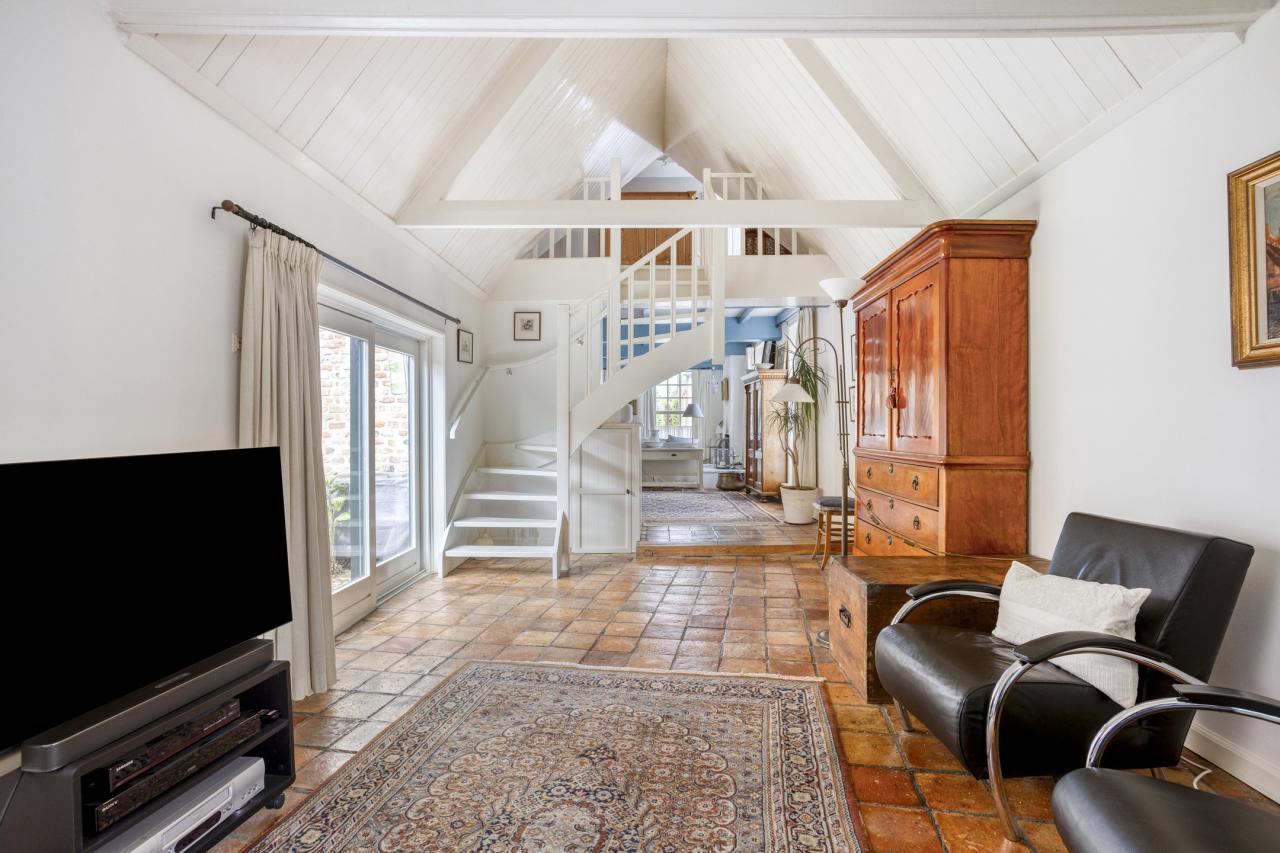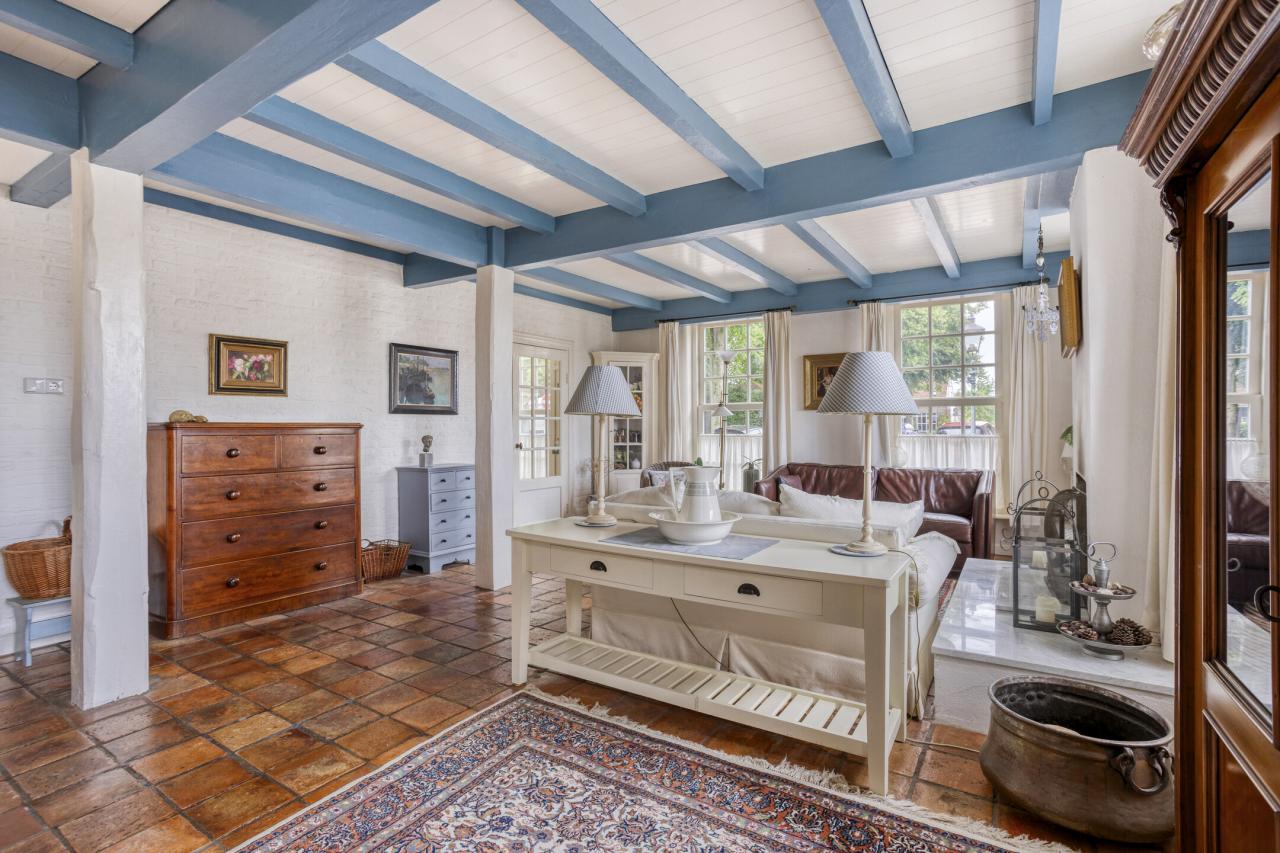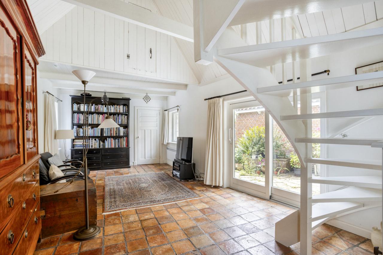 Het verrassende element van deze woning is de grote uitbouw aan de achterzijde, die zorgt voor een forse uitbreiding van het woongedeelte. Hier is een tweede woonkamer gerealiseerd _ een heerlijke ruimte met een schuifpui naar de tuin en een aangename sfeer door het hoge plafond.