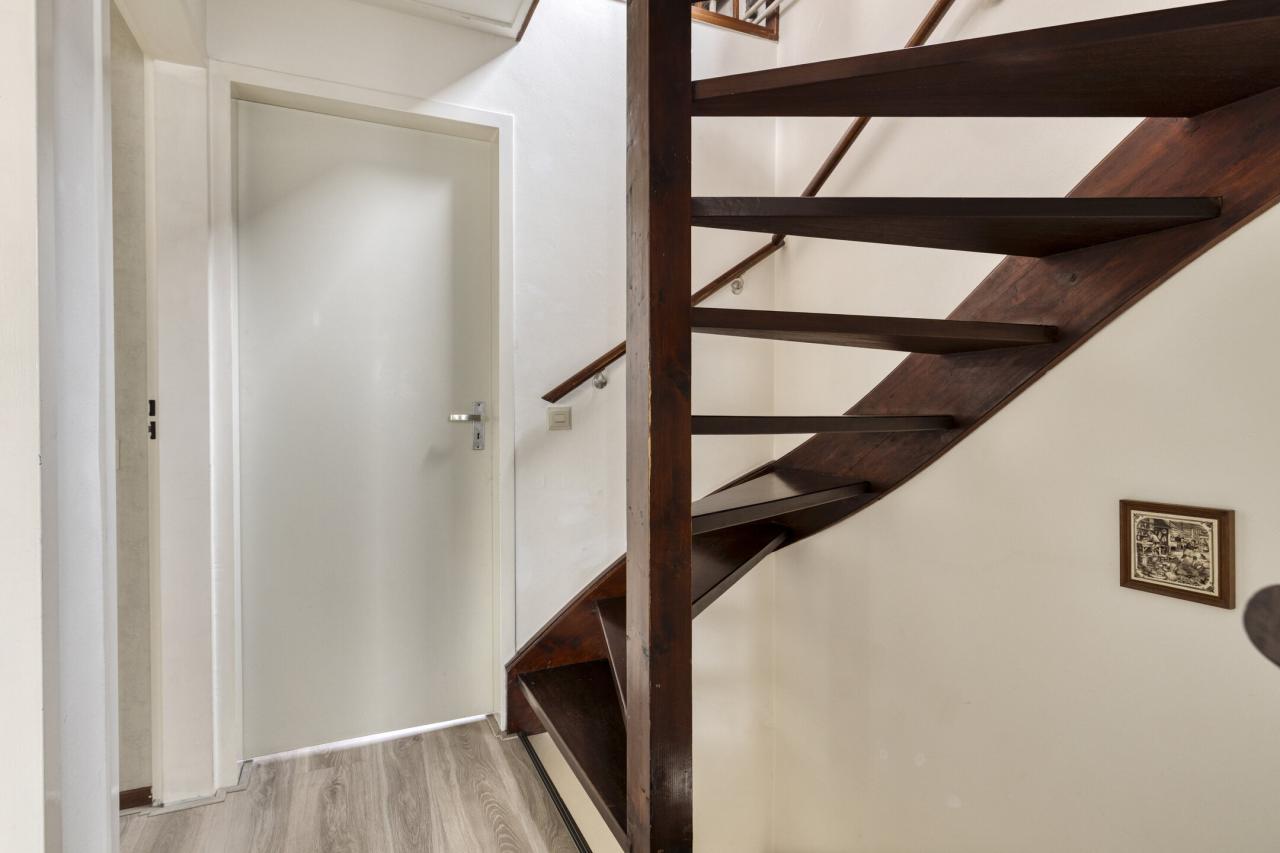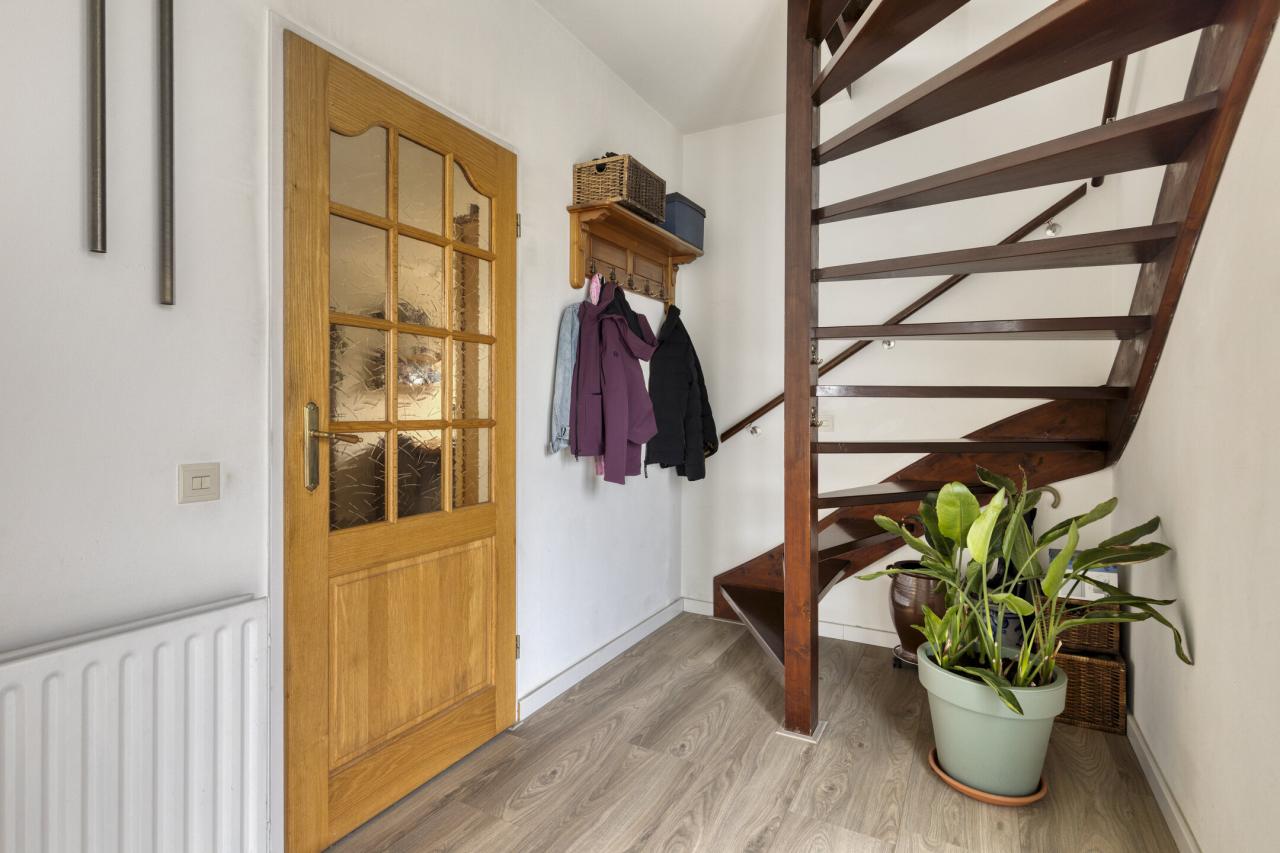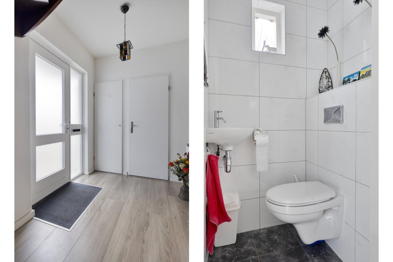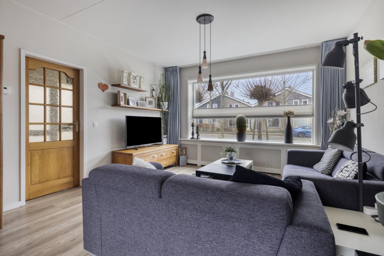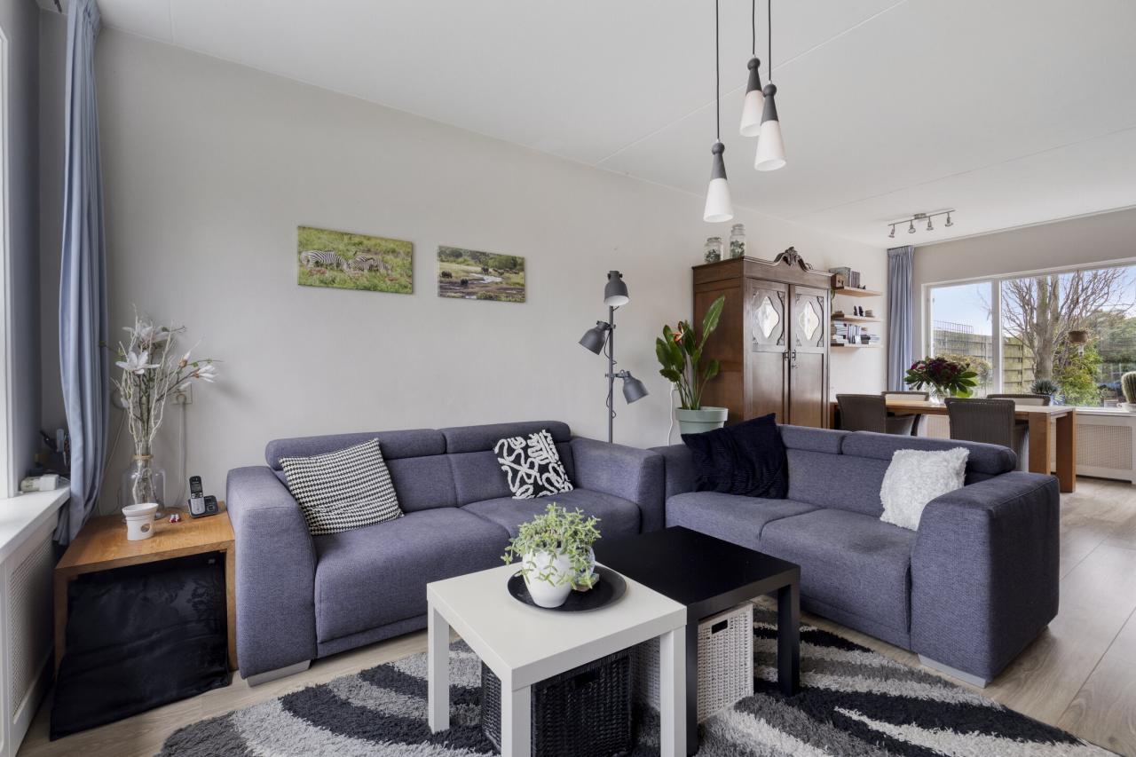 Binnenkomst in de hal met meterkast en toilet met fonteintje. Vanuit de hal stap je in de lichte woonkamer met grote raampartijen, wat zorgt voor een prettige lichtinval en een ruimtelijk gevoel. Aan de achterzijde bevindt zich de halfopen keuken, voorzien van een gasfornuis, combimagnetron, vaatwasser en afzuigkap.