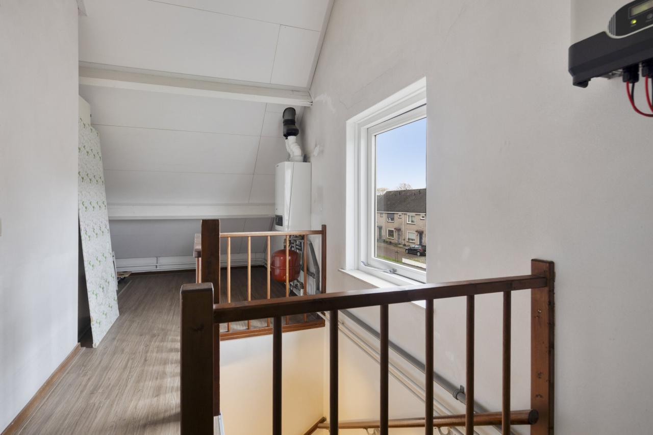 De zolderverdieping is bereikbaar via een vaste trap en beschikt over een overloop met cv-opstelling, bergruimte en een vierde slaapkamer van ca. 14 m² (gemeten binnen de 1,5 m lijn).