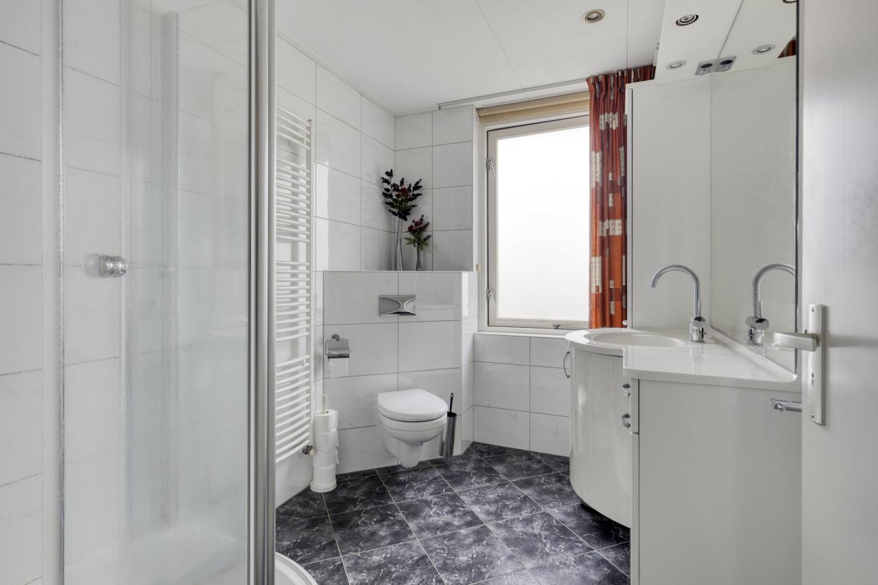 De badkamer is netjes afgewerkt en beschikt over een douche, wastafelmeubel en toilet.