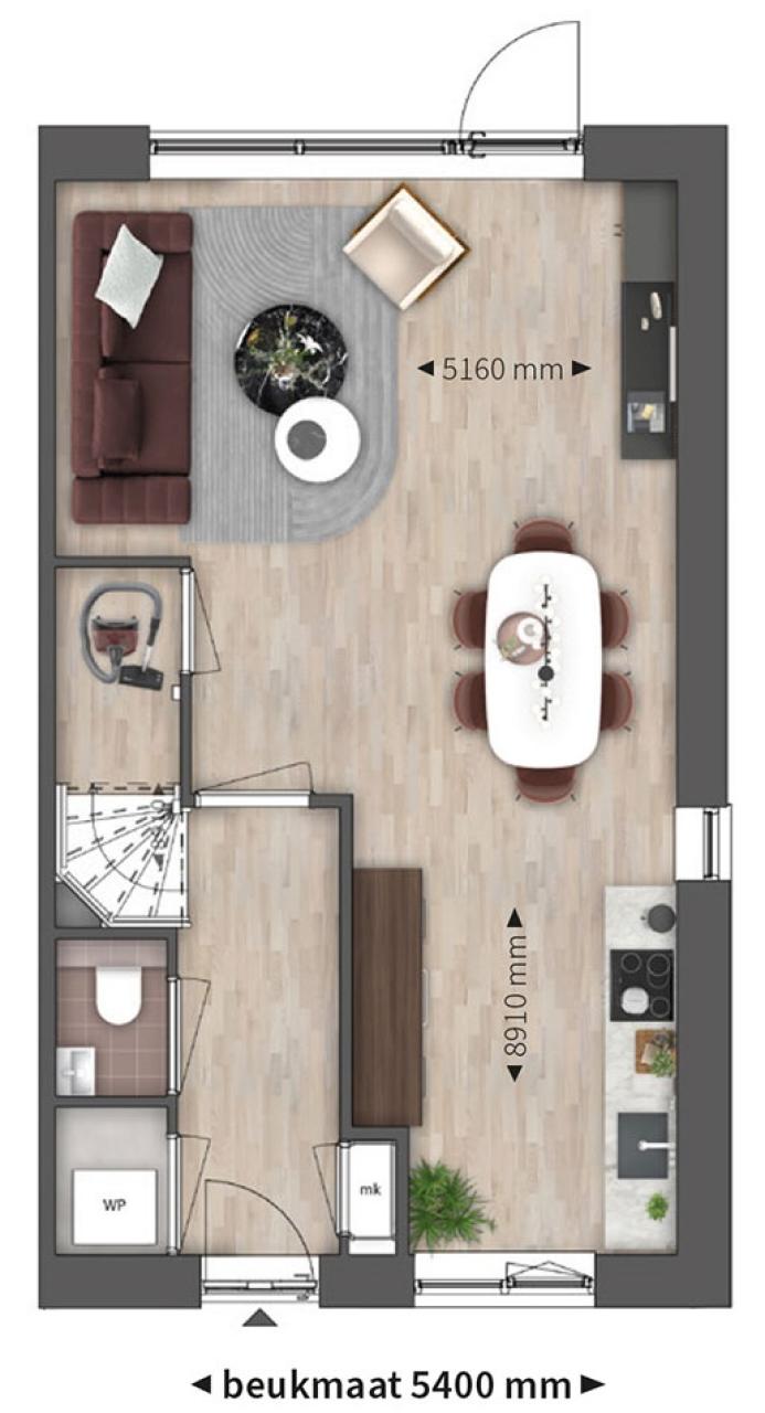Bij binnenkomst passeer je een aparte kastruimte waar de warmtepomp wordt geplaatst, het toilet en vervolgens de trap naar de verdieping. Dan loop je de woonkamer met open keuken binnen. Gelijk tref je een handige trapkast die extra opbergruimte biedt voor allerhande spullen. Het zitgedeelte ligt aan de achterzijde en door de grote raampartij kijk je daar heerlijk de tuin in. De keukenopstelling is aan de voorzijde gepland en daar worden dan ook de aansluitingen voorzien.