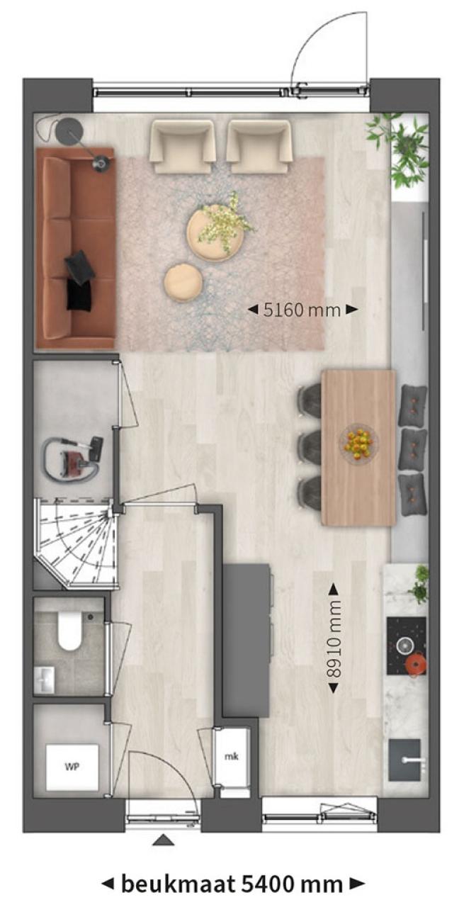 Bij binnenkomst passeer je een aparte kastruimte waar de warmtepomp wordt geplaatst, het toilet en vervolgens de trap naar de verdieping. Dan loop je de woonkamer met open keuken binnen. Gelijk tref je een handige trapkast die extra opbergruimte biedt voor allerhande spullen. Het zitgedeelte ligt aan de achterzijde en door de grote raampartij kijk je daar heerlijk de tuin in. De keukenopstelling is aan de voorzijde gepland en daar worden dan ook de aansluitingen voorzien.