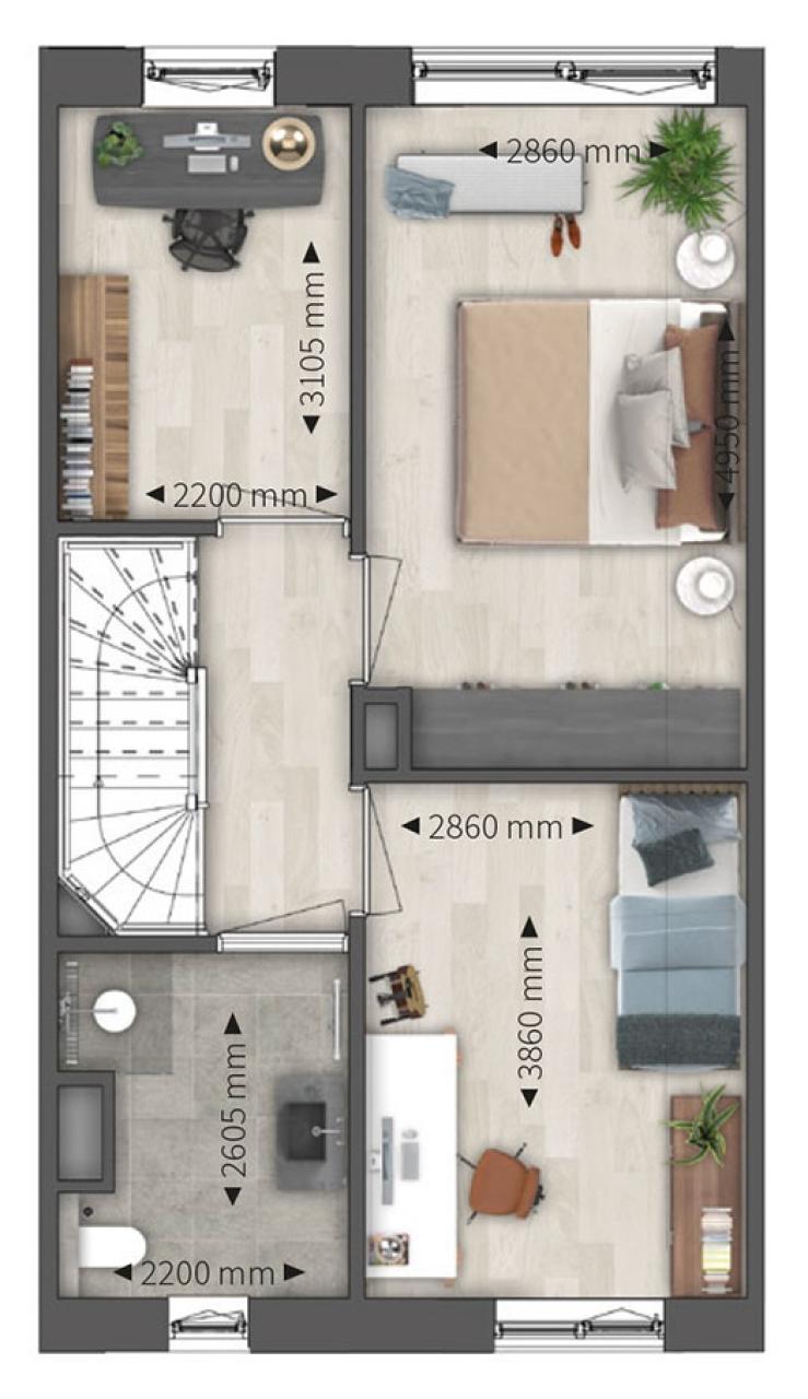 Op de verdieping zijn 3 slaapkamers van resp. 7m2, 11m2 en 14m2. De badkamer is voorzien van een inloopdouche, wastafel en toilet. De afwerking van de badkamer en het toilet zijn inbegrepen in de koopsom en hiervoor is een sanitair- en tegelpakket samengesteld.