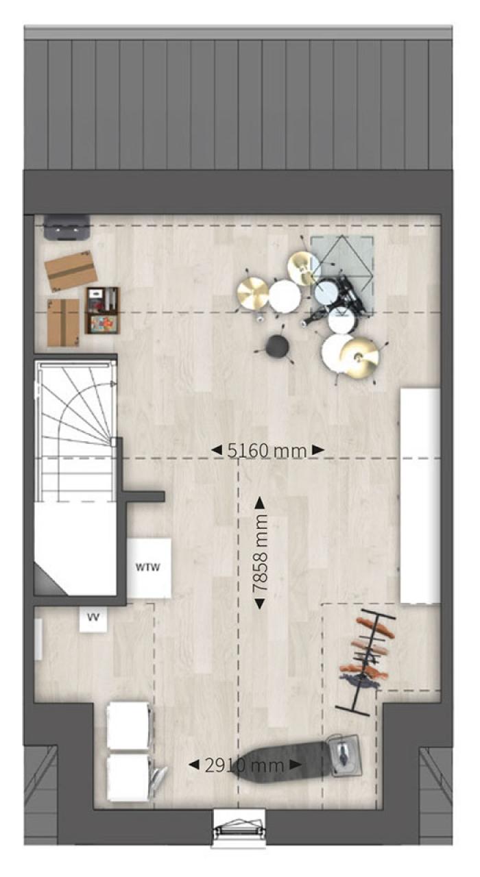 De open zolder is ruim en daar bevinden zich diverse technische installaties en de aansluiting voor de wasmachine. De zolder kan optioneel voorzien worden van een indeling waardoor de woning over totaal 4 slaapkamers beschikt. Doordat deze woning voorzien is van een kopgevel beschikt de zolder over een groter vloeroppervlak.