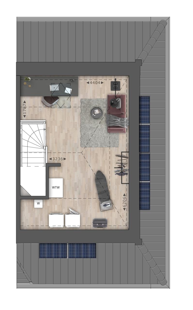 Er is een open zolder en daar bevinden zich diverse technische installaties en de aansluiting voor de wasmachine. De zolder kan optioneel voorzien worden van een indeling waardoor de woning over totaal 4 slaapkamers beschikt.