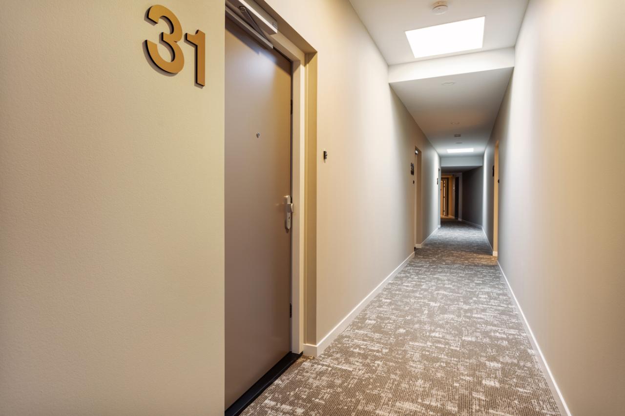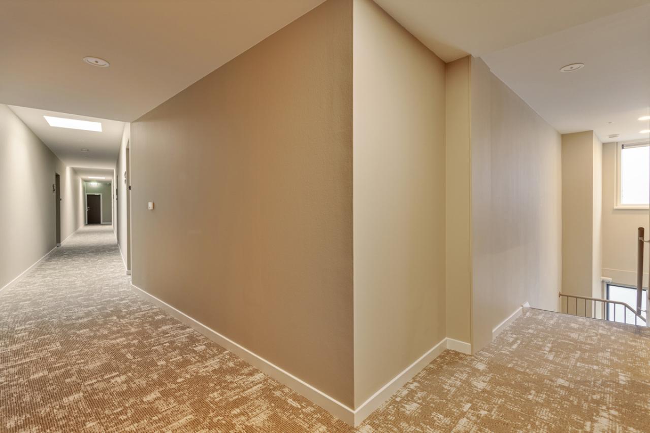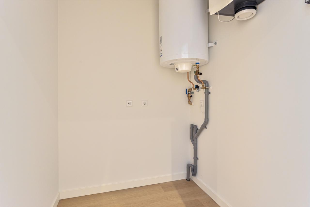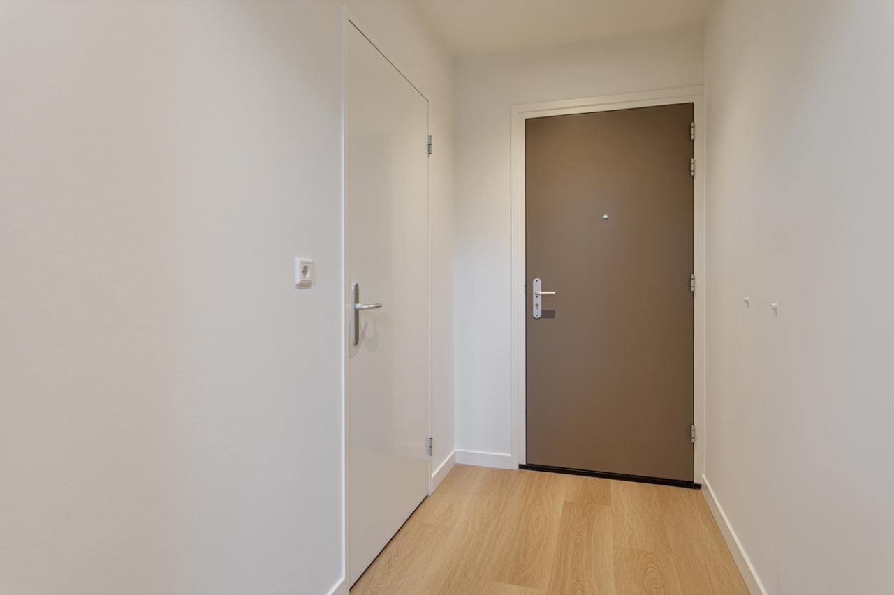 U betreedt het appartement via uw eigen voordeur, waarna u binnenkomt in een ruime hal. Vanuit hier heeft u toegang tot de technische ruimte met aansluiting voor de wasmachine en de woonruimte.