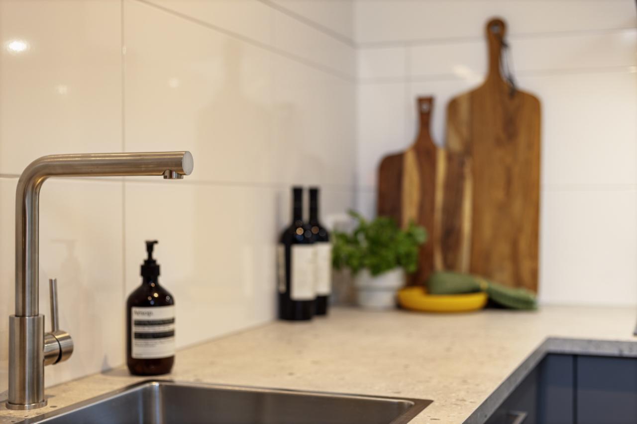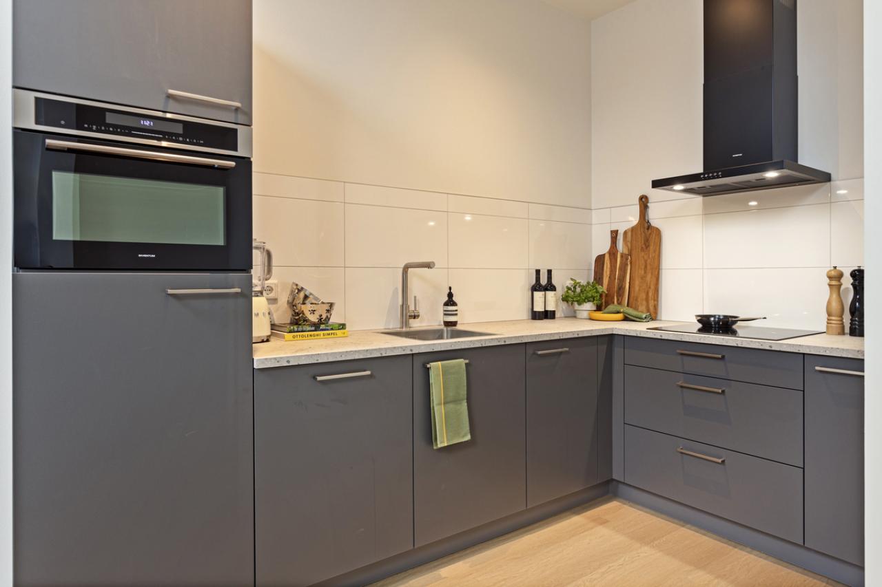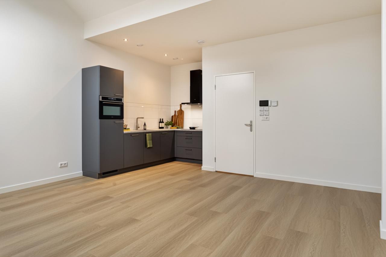 De woonkamer vormt het hart van het appartement en staat in open verbinding met de moderne keuken. De keuken is strak en eigentijds uitgevoerd en voorzien van diverse inbouwapparatuur, waaronder een combimagnetron, vaatwasser, koelkast, afzuigkap en een inductiekookplaat.