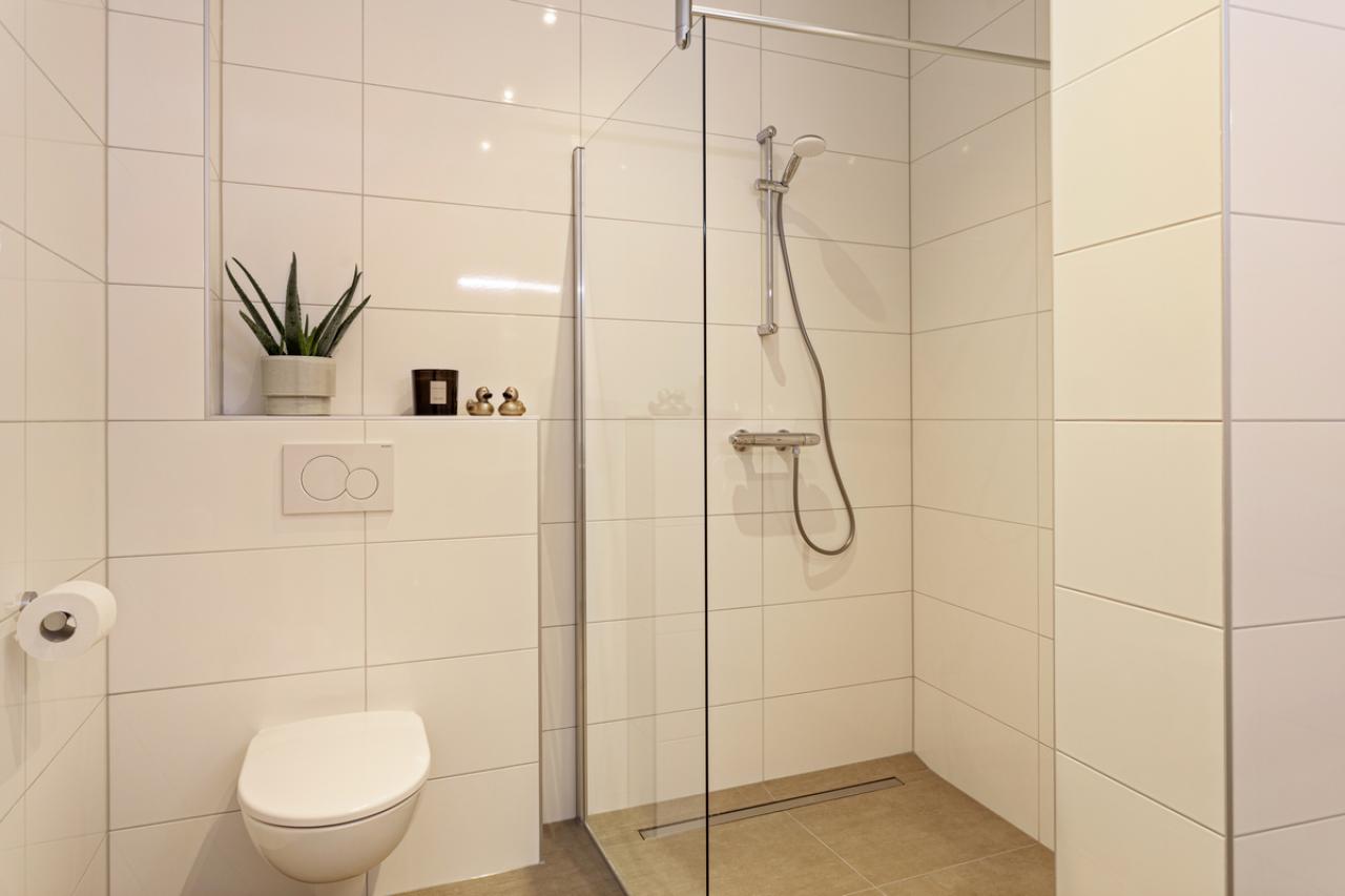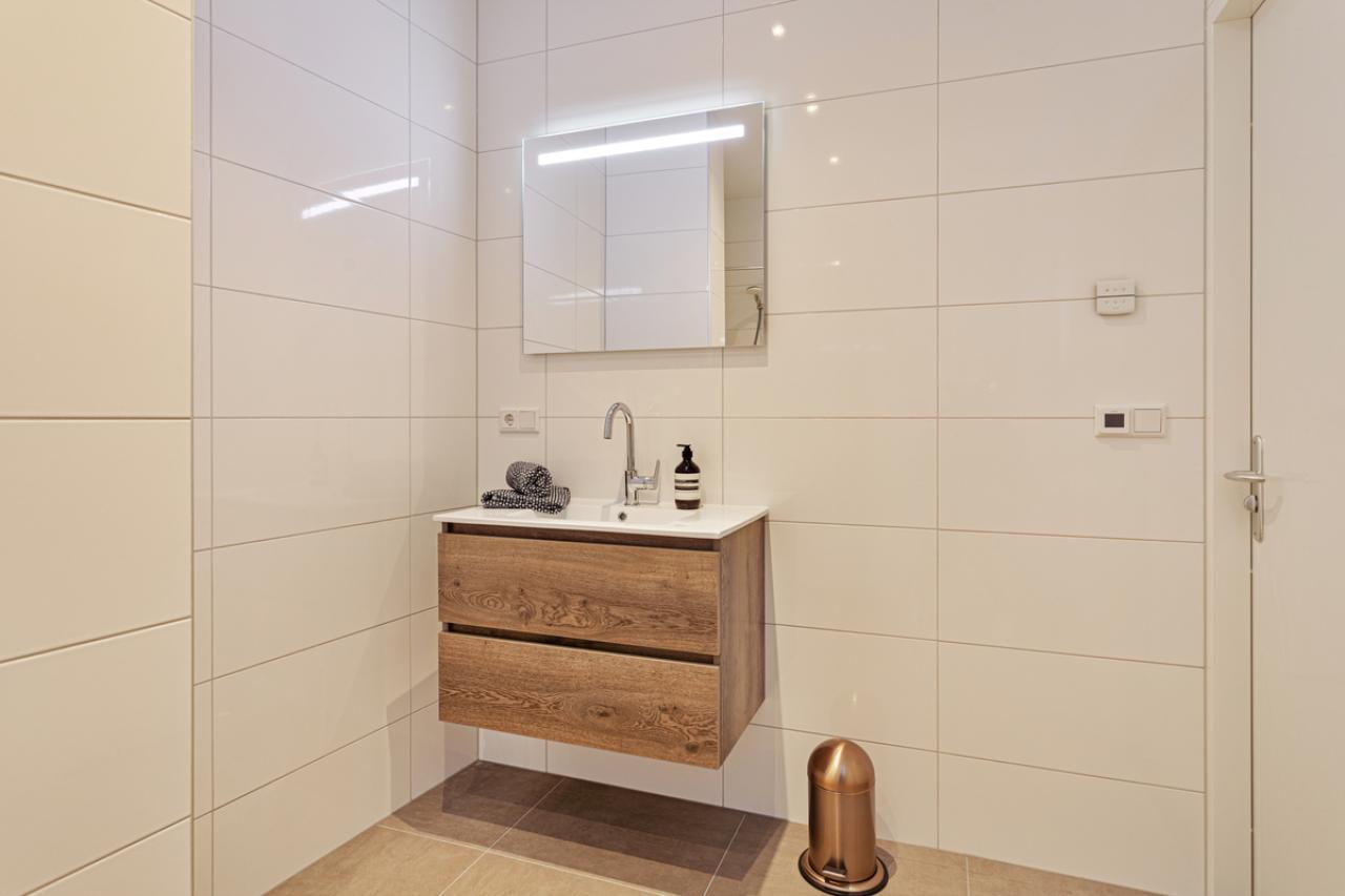 Via de woonkamer bereikt u de badkamer. Deze is modern afgewerkt en volledig betegeld tot aan het plafond met grote witte wandtegels en een mokkakleurige vloertegel. De badkamer beschikt over een wastafelmeubel in eikenlook, een inloopdouche, toilet, elektrische vloerverwarming en mechanische ventilatie.