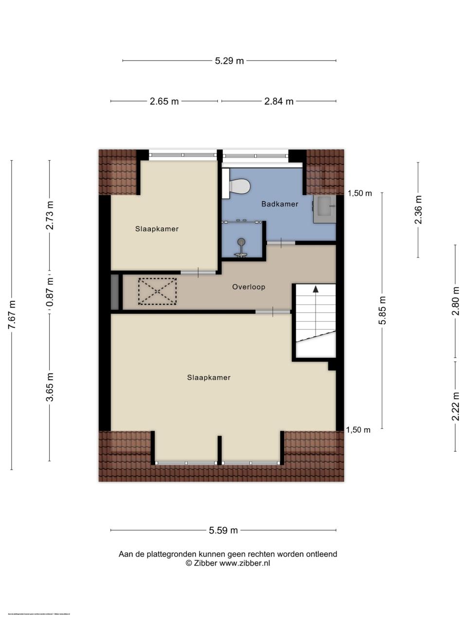 - Grote slaapkamer aan de voorzijde (ca. 5.60 × 3.60 m), eventueel te splitsen in twee kamers