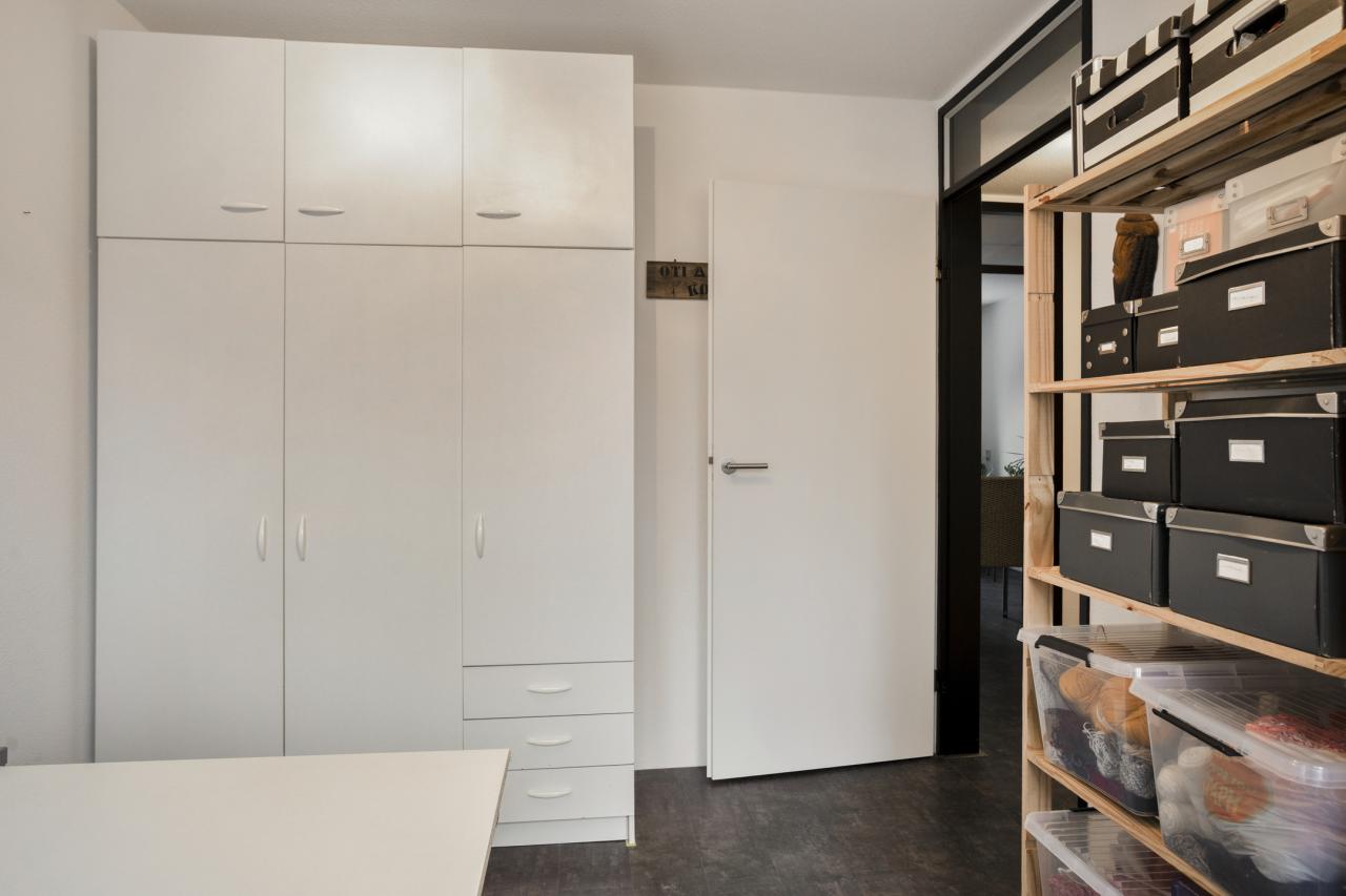 De garage is bereikbaar via de achtergelegen straat en biedt parkeergelegenheid op eigen terrein. De voormalige garagedeur is vervangen door een loopdeur, wat het gebruik met de fiets bijzonder praktisch maakt.