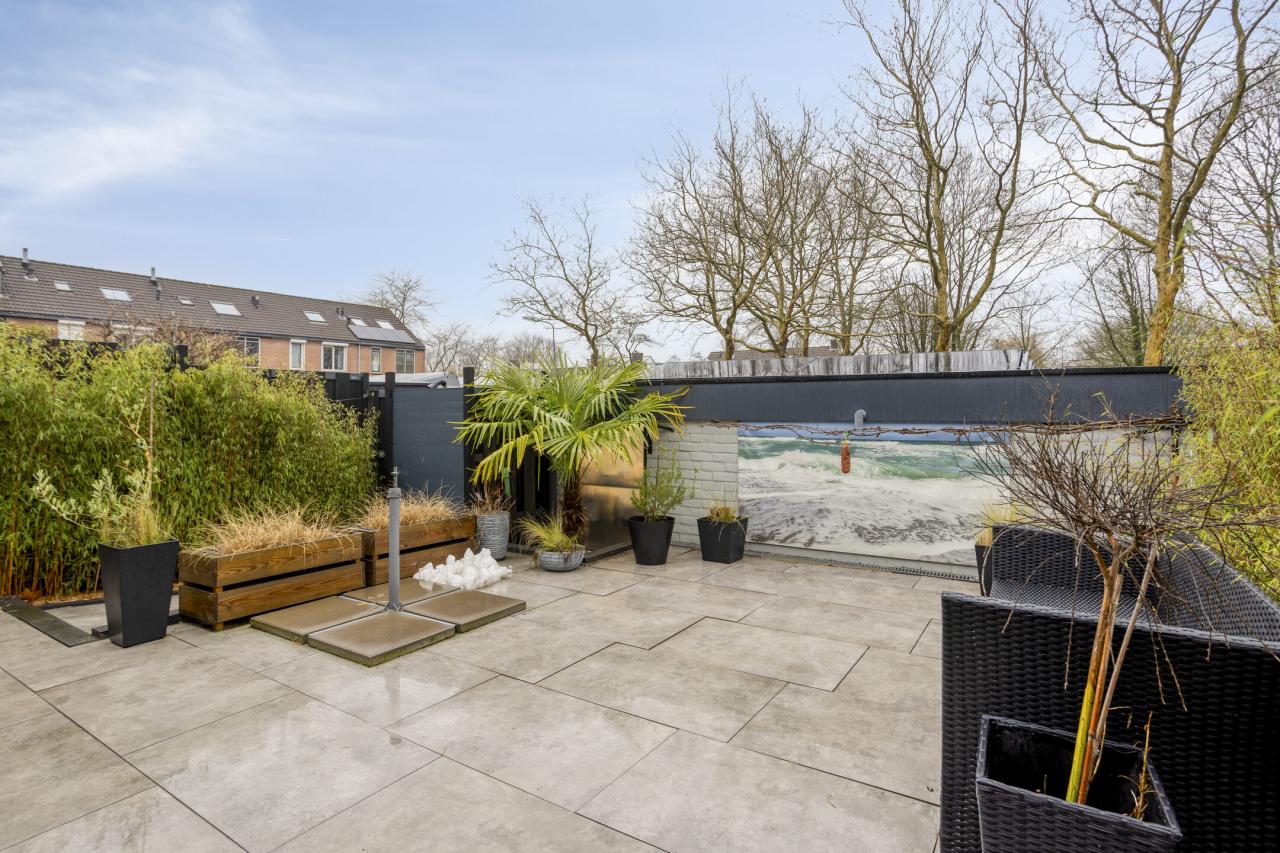 De onderhoudsvriendelijke achtertuin is op het noorden gelegen, maar dankzij de vrije ligging aan de westzijde kun je hier tot in de avond van de zon genieten. De tuin is strak aangelegd met keramische tegels en onderhoudsvrije schuttingen. Achterin de tuin is een poort die toegang geeft tot de iets lager gelegen garage.