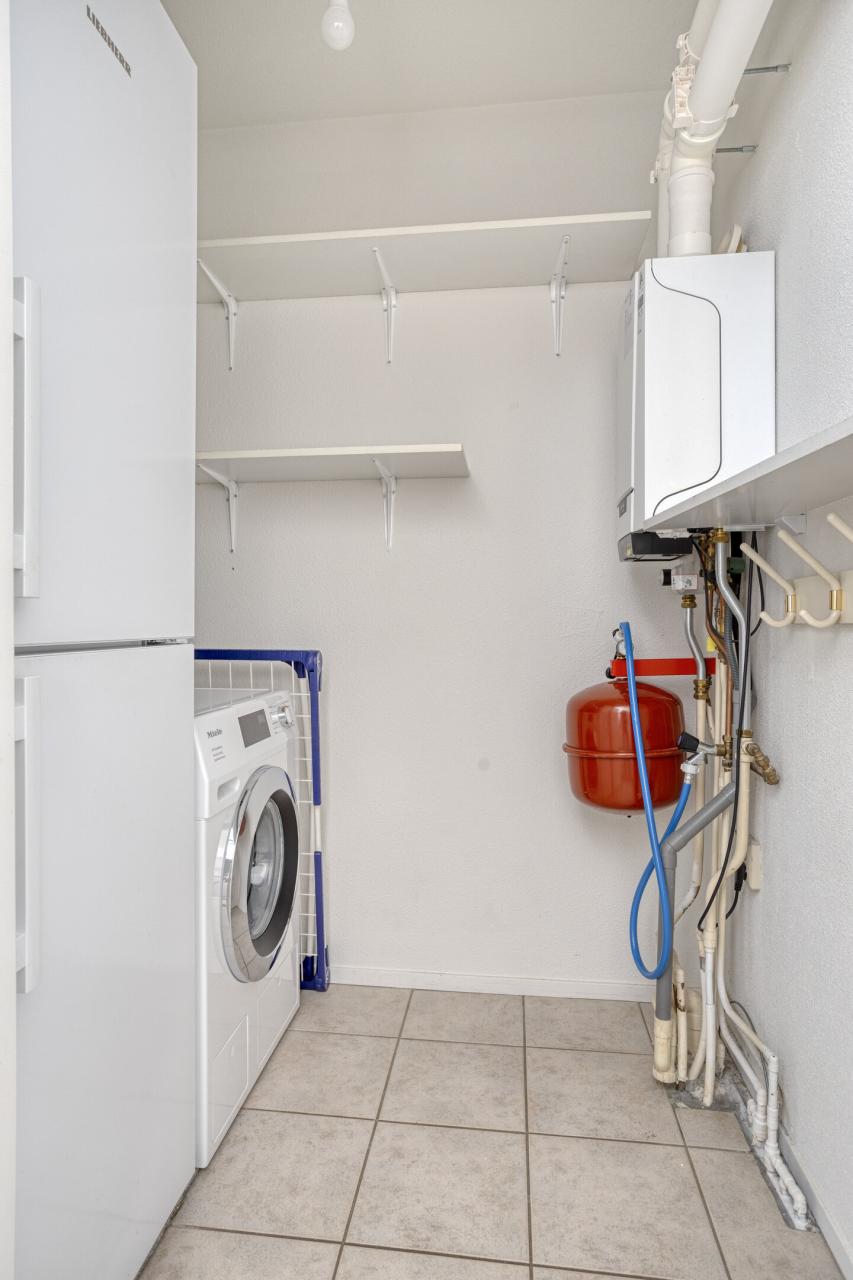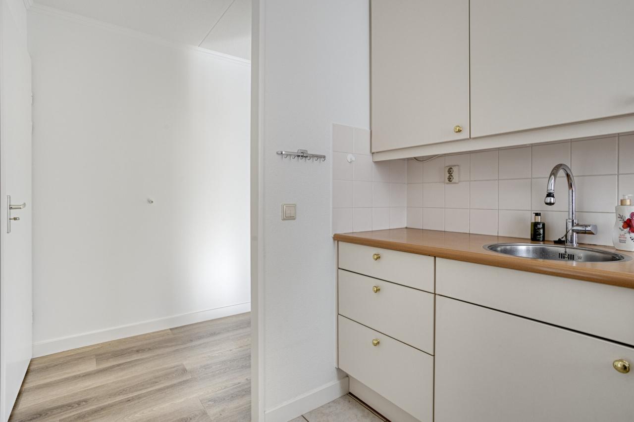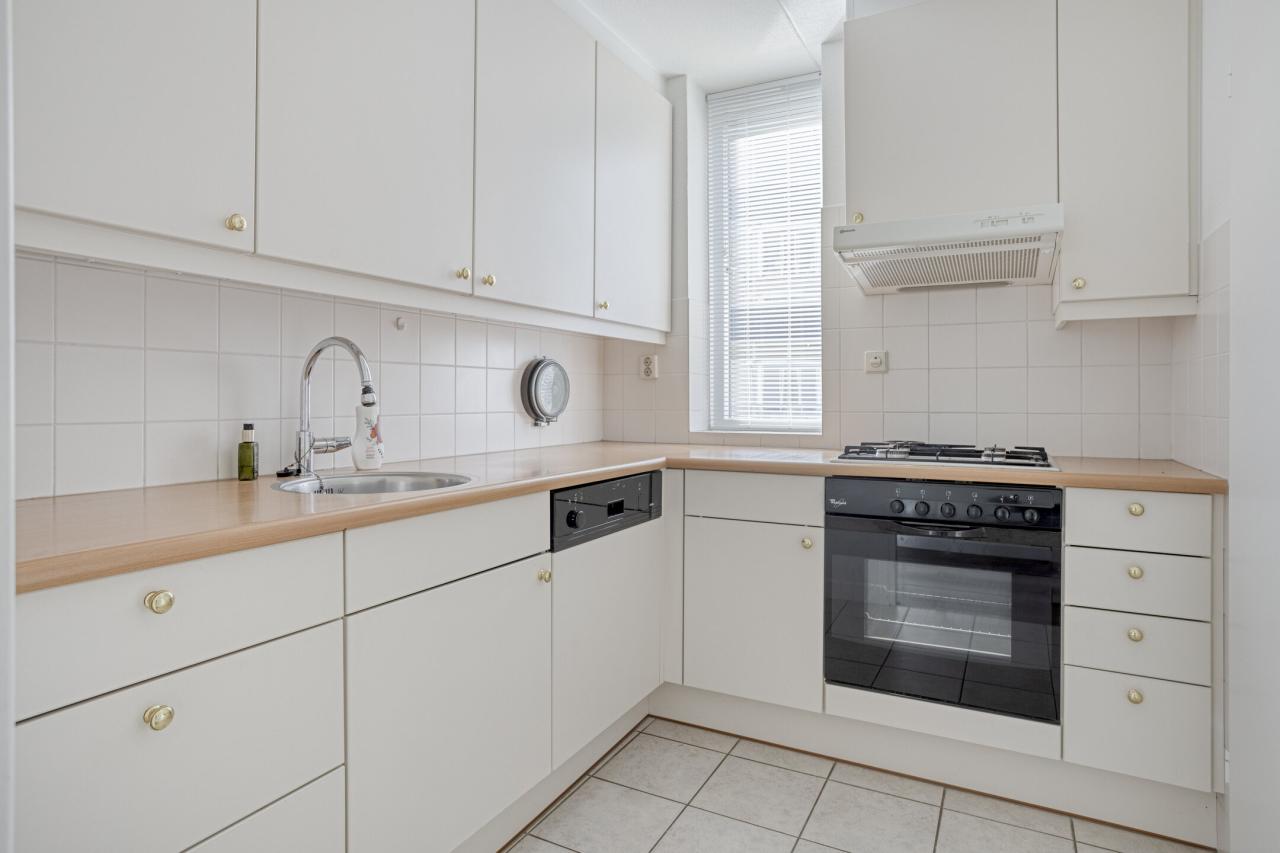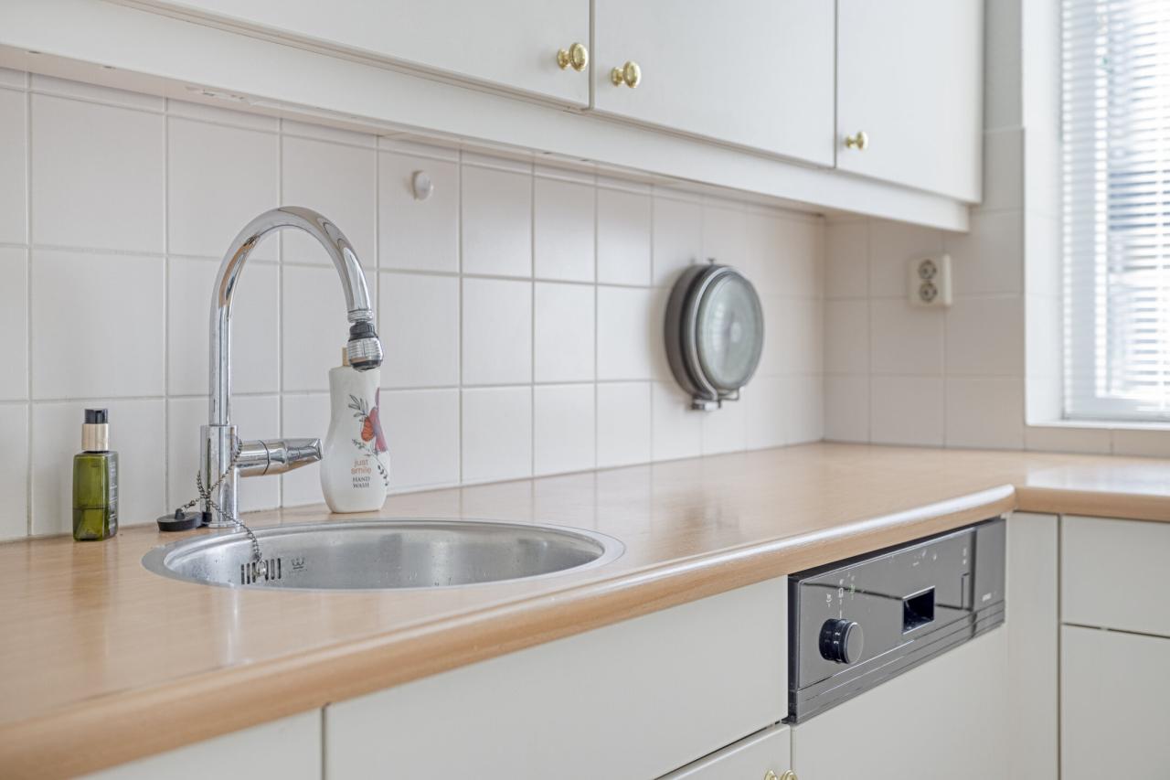 Achter de eigen voordeur ligt een hal met meterkast en toilet. De woonkamer (ca. 32 m²) biedt een mooi uitzicht over het water en de jachthaven. Dankzij de erker aan de zijgevel is er veel natuurlijke lichtinval. De halfopen keuken is netjes en functioneel, voorzien van een hoekopstelling met voldoende werkruimte en inbouwapparatuur, waaronder een gaskookplaat, oven, afzuigkap, vaatwasser. Aansluitend bevindt zich een praktische bijkeuken met cv-opstelling en aansluitingen voor wasmachine en droger.