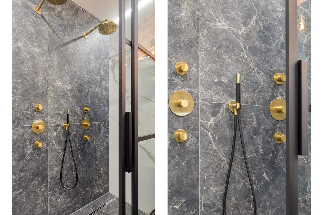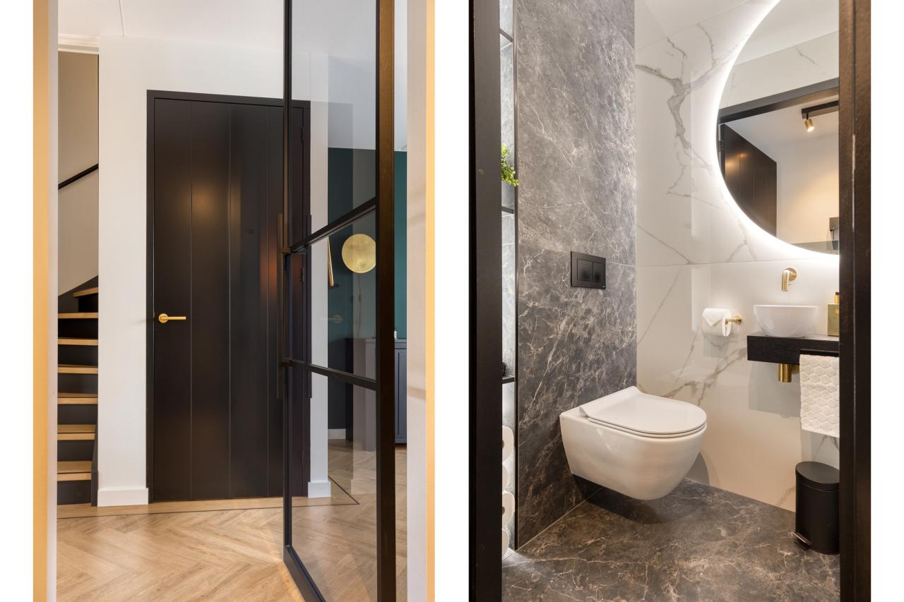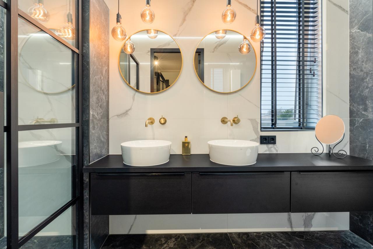 Ook op de eerste verdieping en beide trappen ligt dezelfde hoogwaardige vloer als beneden. Vanaf de overloop zijn drie slaapkamers en de badkamer bereikbaar. De luxe badkamer is uitgevoerd met een dubbele regendouche, gouden kranen, wastafelmeubel met twee kranen en een hangtoilet. De afwerking met antraciet marmeren tegelwerk en gouden accenten geeft de ruimte een chique hotelsfeer.