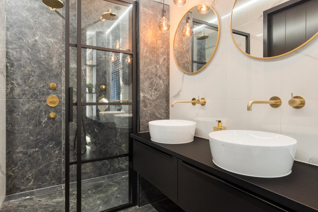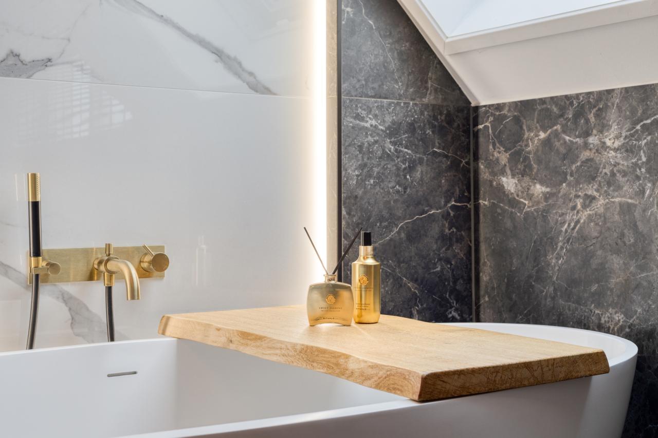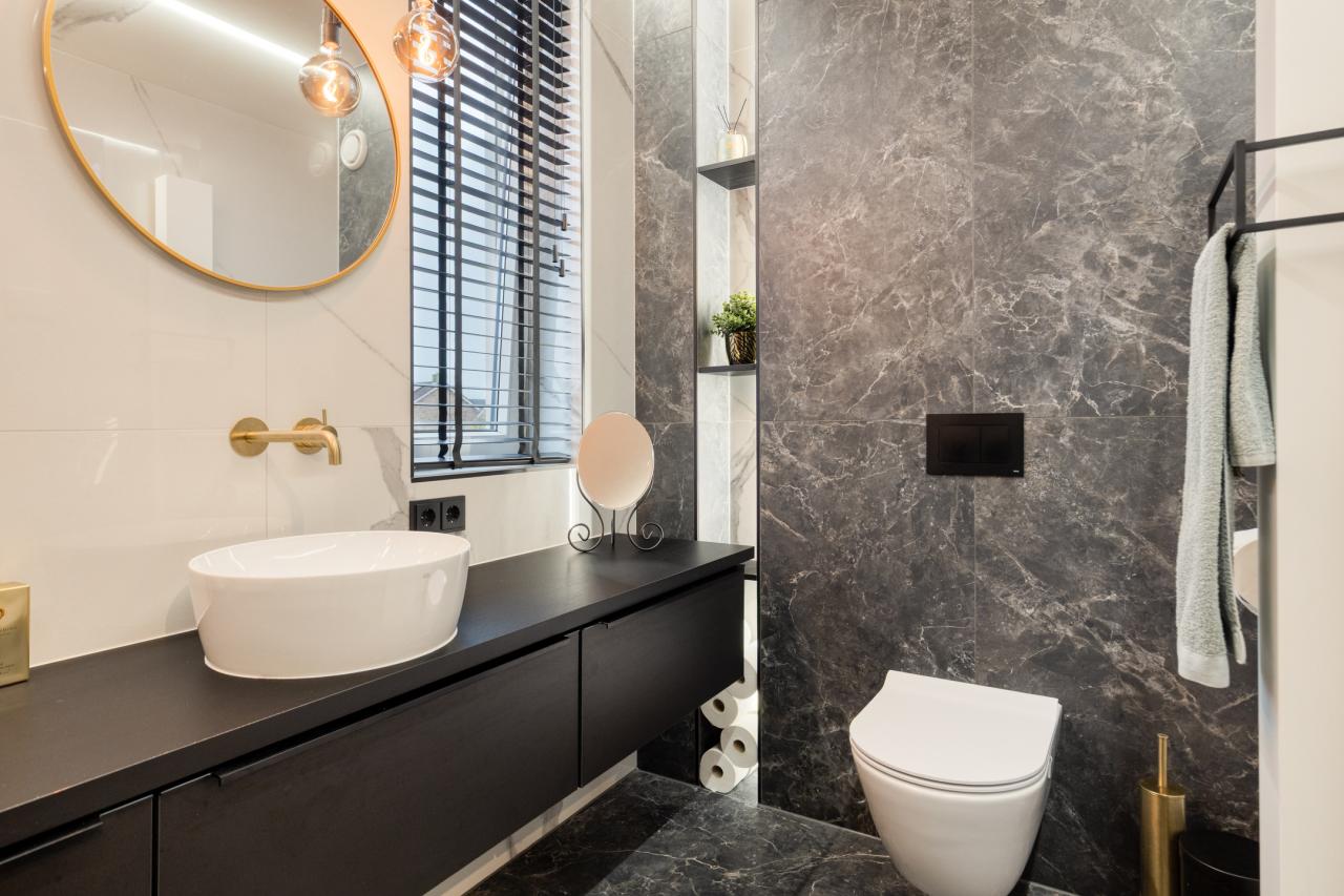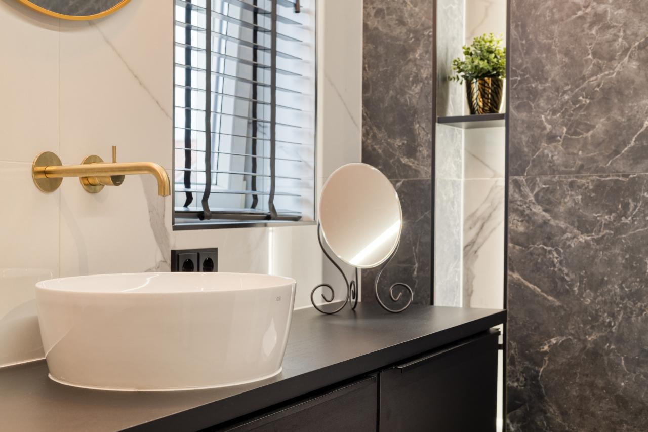 Ook op de eerste verdieping en beide trappen ligt dezelfde hoogwaardige vloer als beneden. Vanaf de overloop zijn drie slaapkamers en de badkamer bereikbaar. De luxe badkamer is uitgevoerd met een dubbele regendouche, gouden kranen, wastafelmeubel met twee kranen en een hangtoilet. De afwerking met antraciet marmeren tegelwerk en gouden accenten geeft de ruimte een chique hotelsfeer.