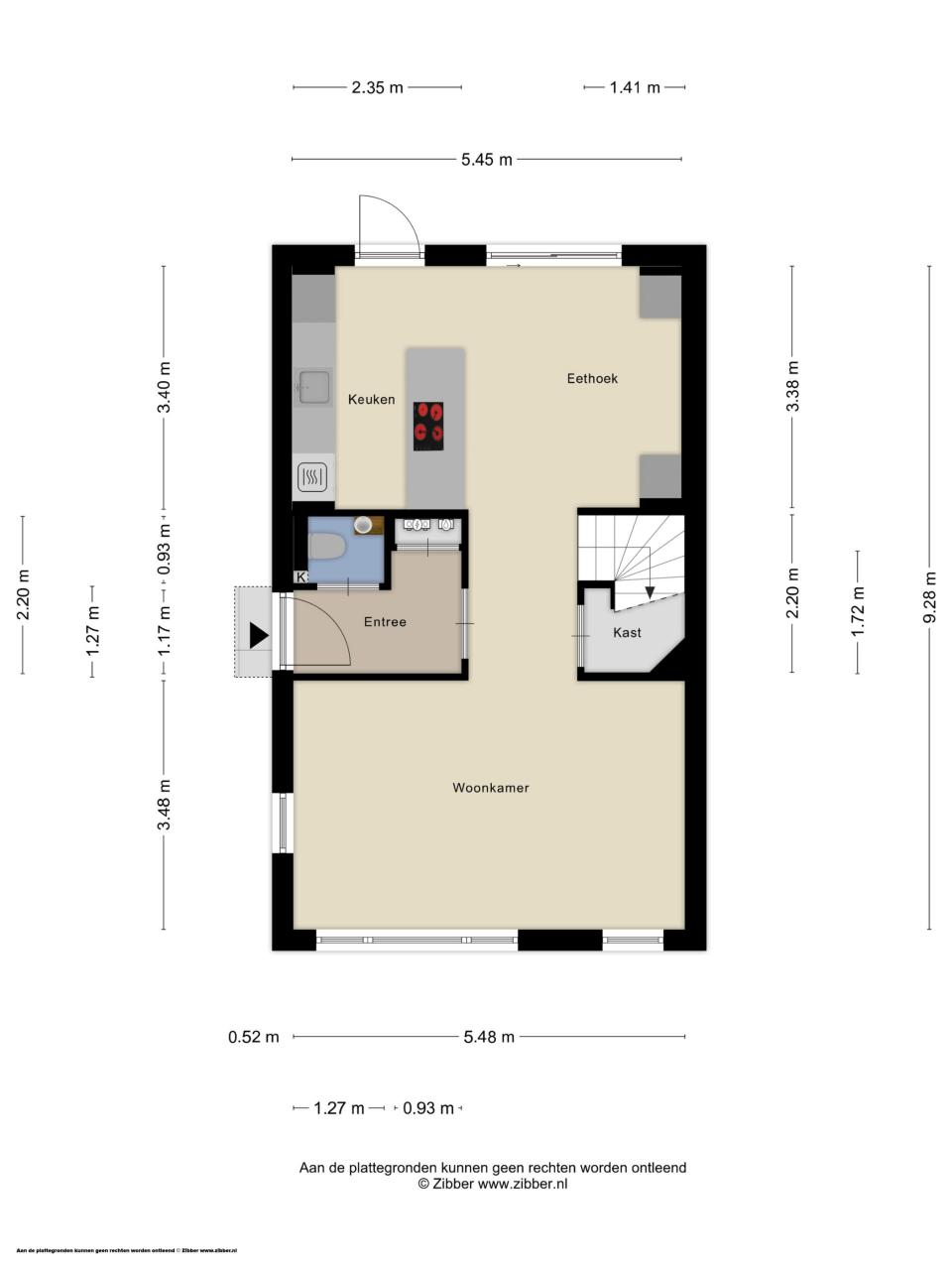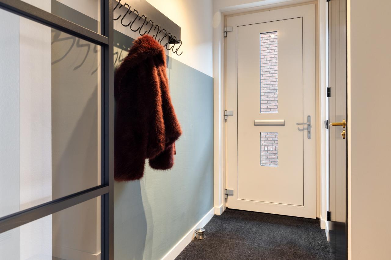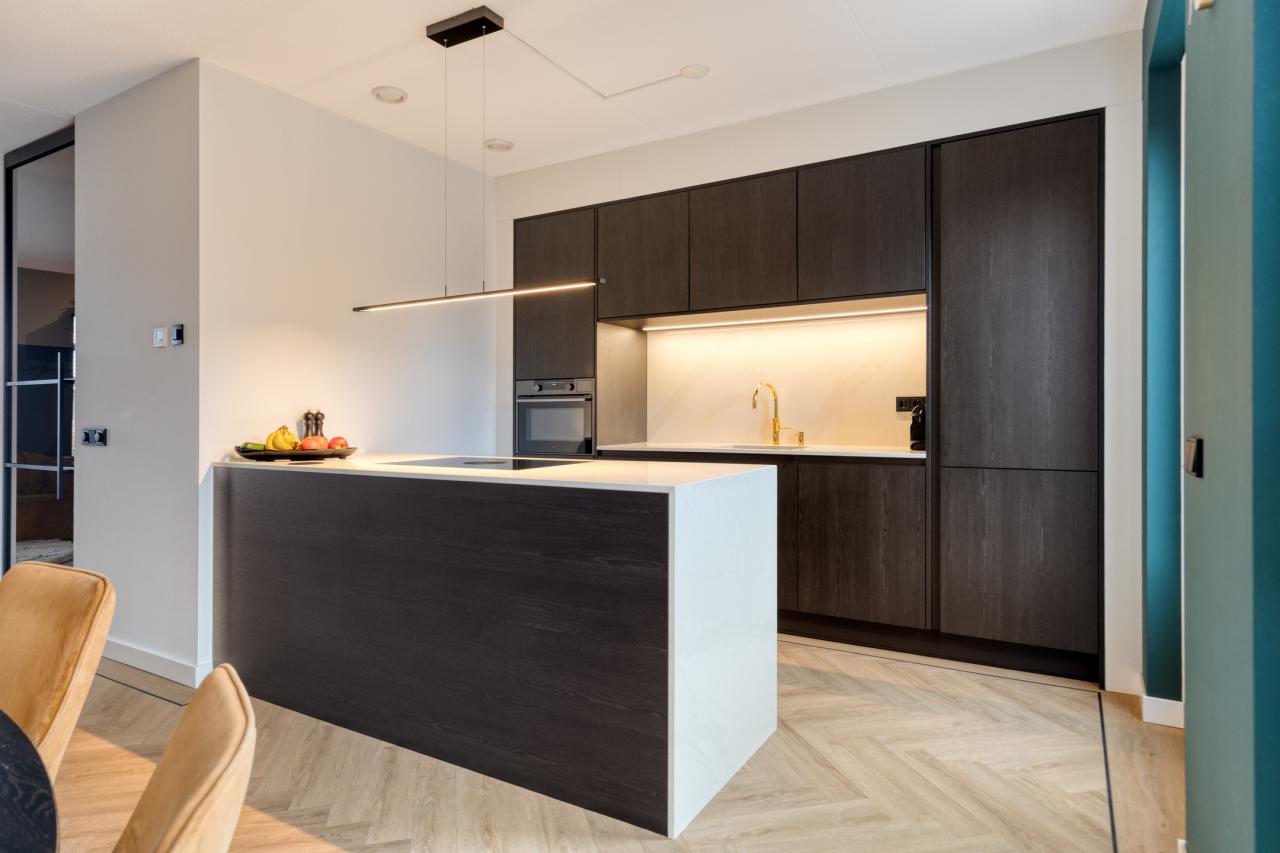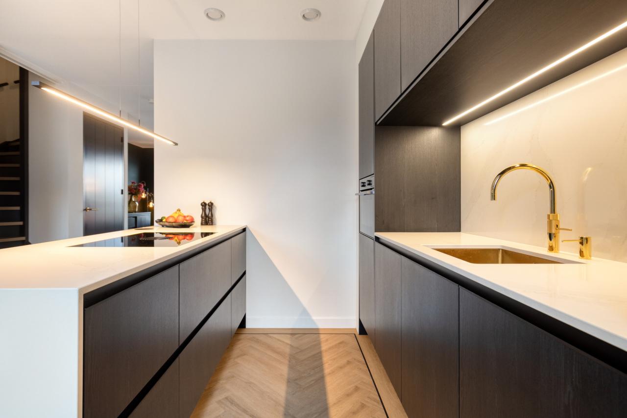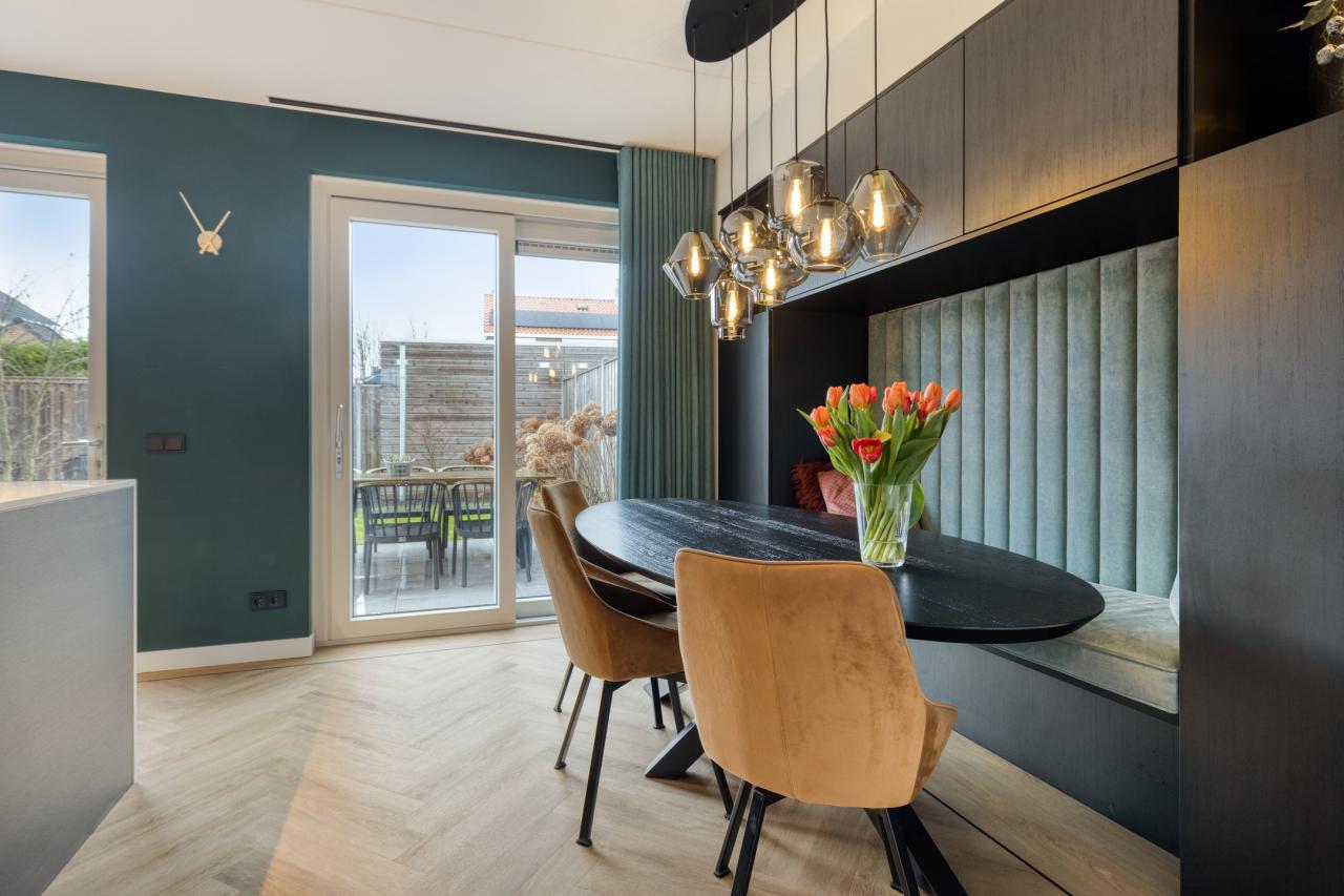 Entree met hal, meterkast en luxe toilet. De zitkamer is gelegen aan de voorzijde en beschikt over veel lichtinval. Aan de tuinzijde bevindt zich de moderne keuken, afgewerkt in een tijdloos design met hoogwaardige inbouwapparatuur, waaronder een Bora kookplaat, combi-oven met stoomfunctie, Quooker, vaatwasser en telefoonlader met ingebouwd stopcontact. De keuken biedt voldoende ruimte voor een royale eethoek met op maat gemaakte kasten en geeft via de schuifpui en openslaande tuindeur toegang tot het terras.