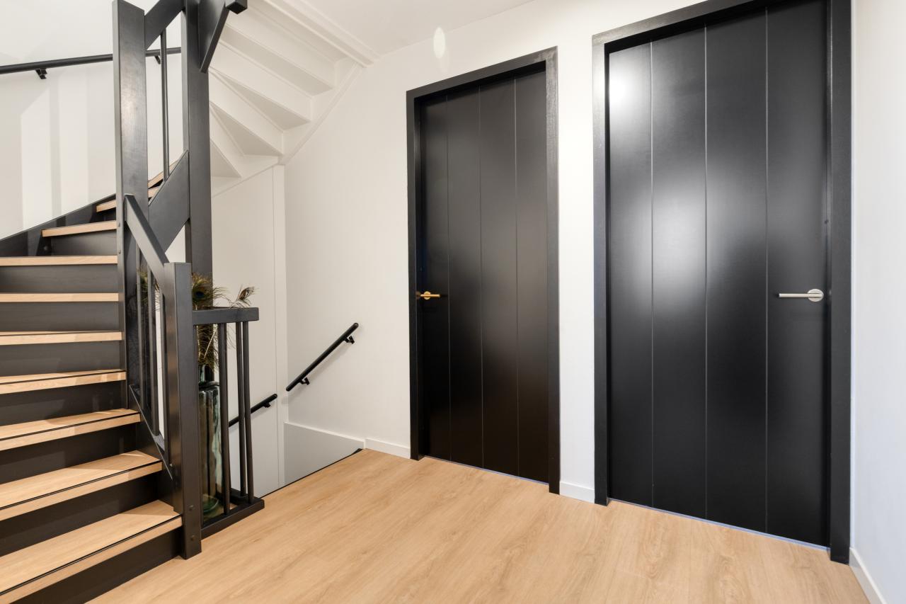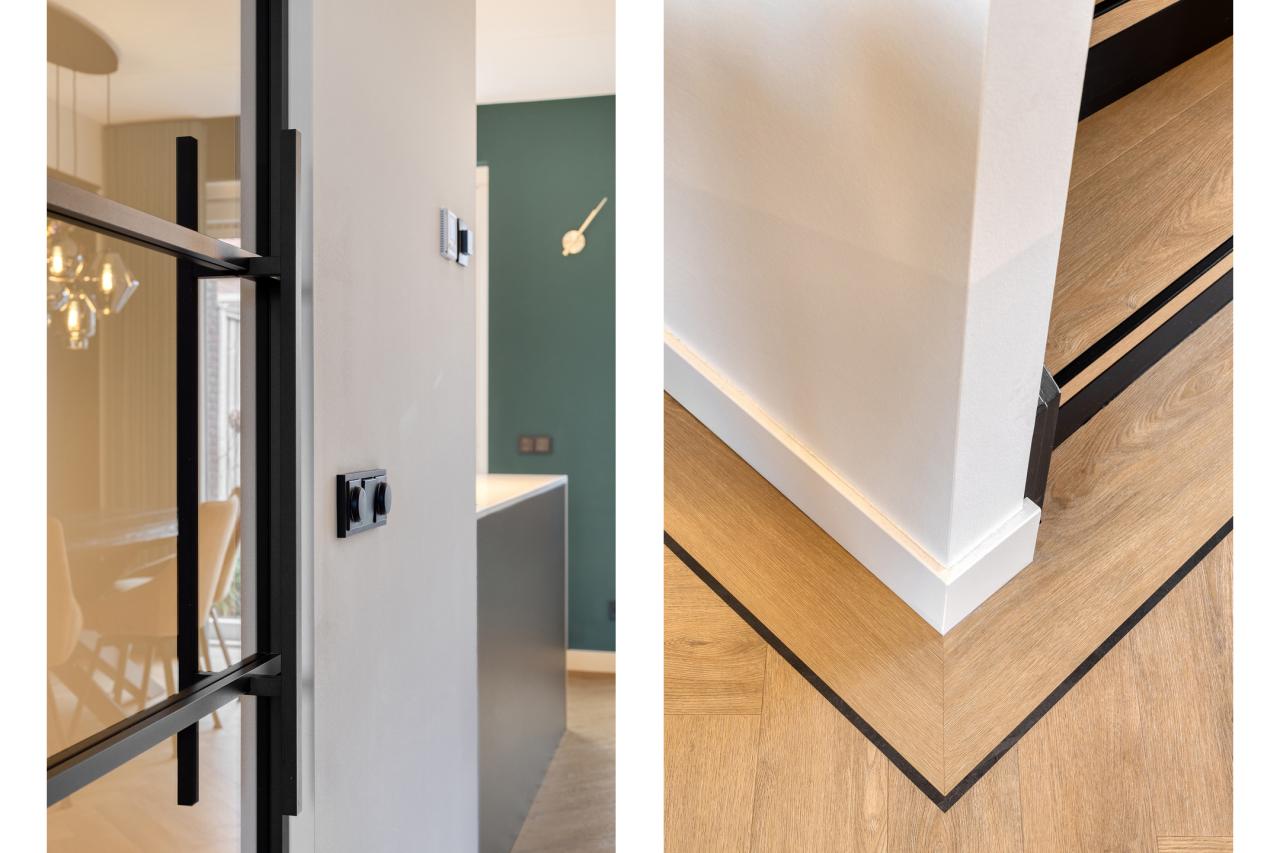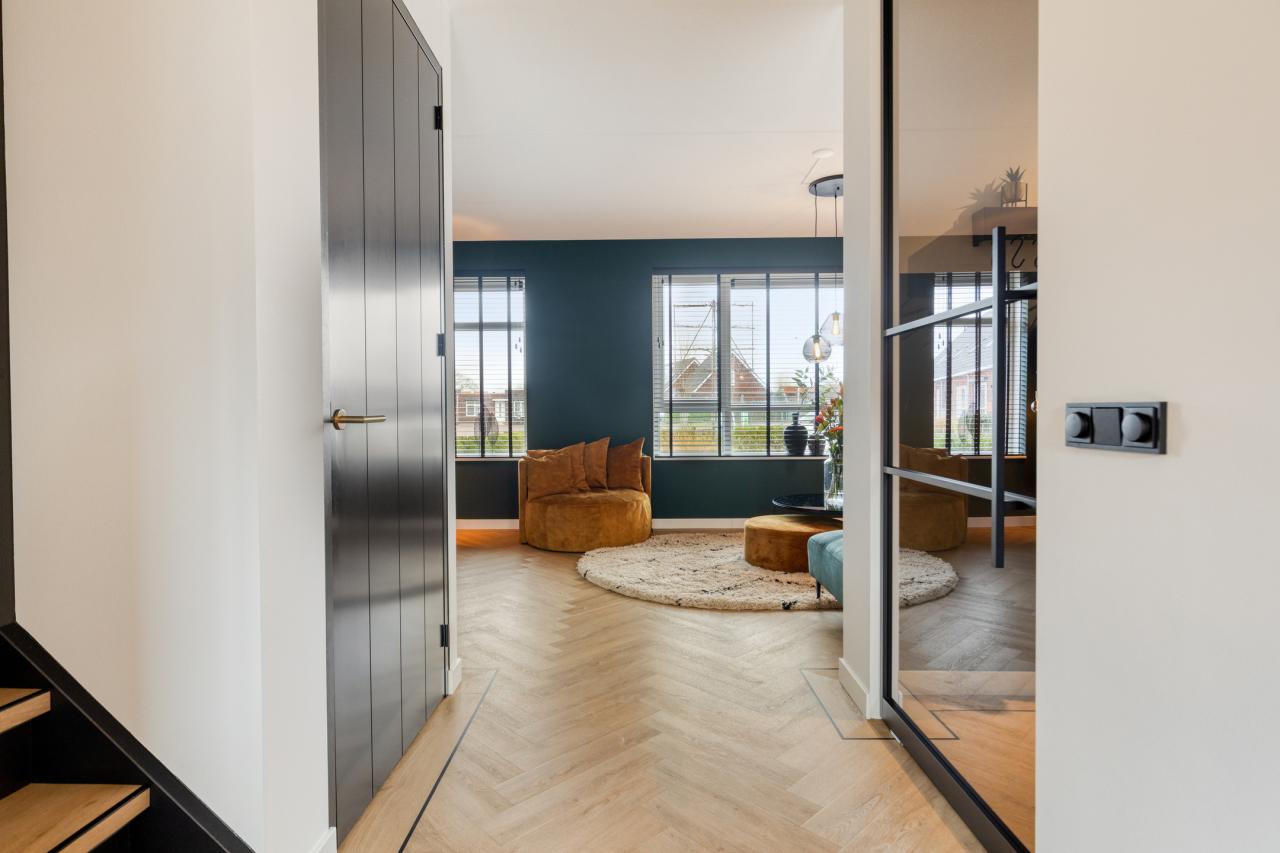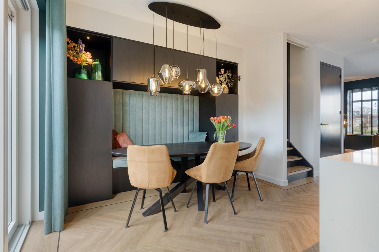 De gehele begane grond is afgewerkt met een pvc-vloer in visgraatmotief in eikenlook, wat zorgt voor een warme en luxe uitstraling.