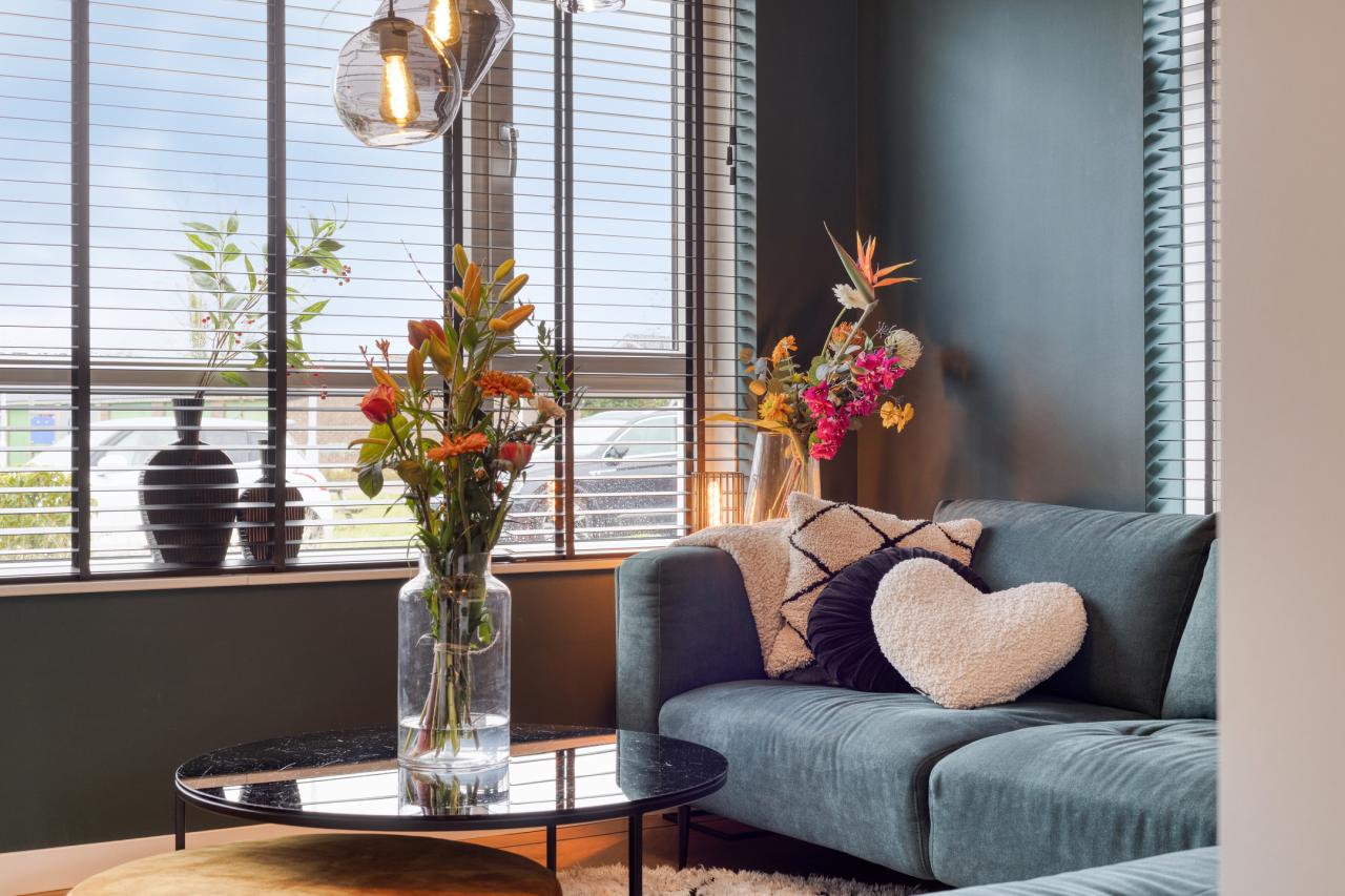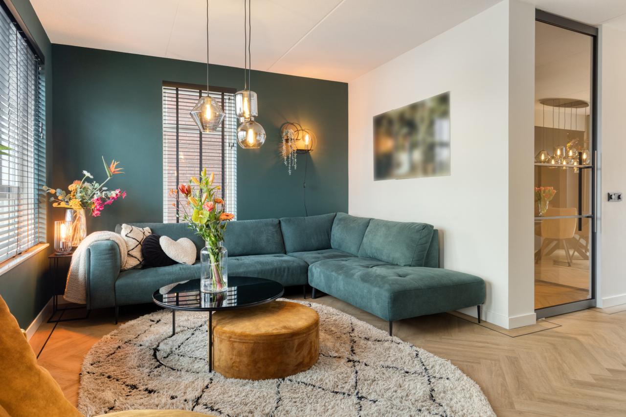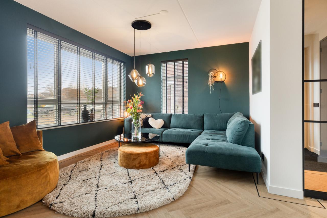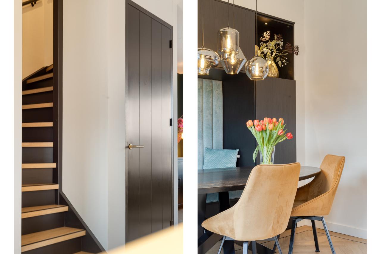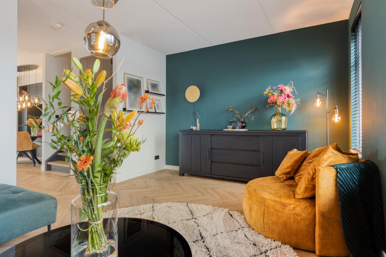 De gehele begane grond is afgewerkt met een pvc-vloer in visgraatmotief in eikenlook, wat zorgt voor een warme en luxe uitstraling.