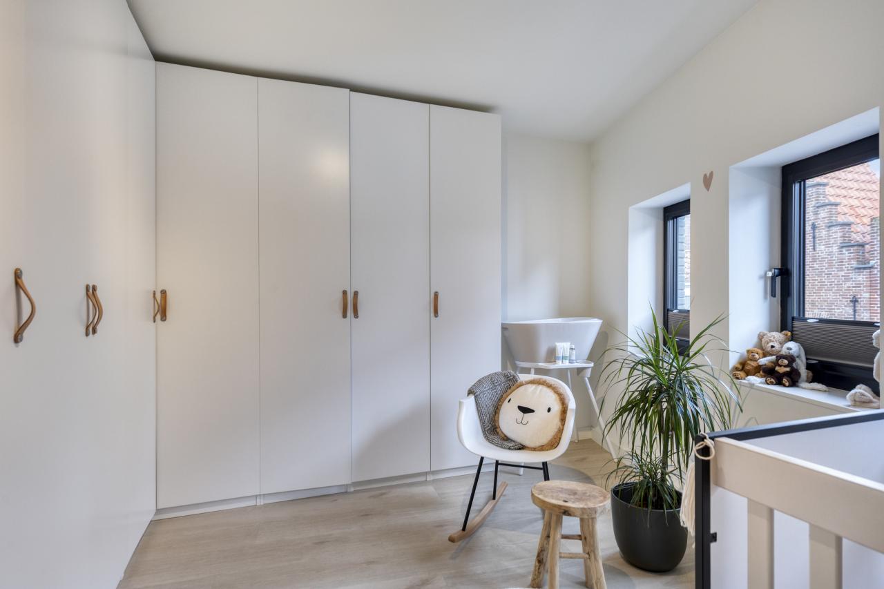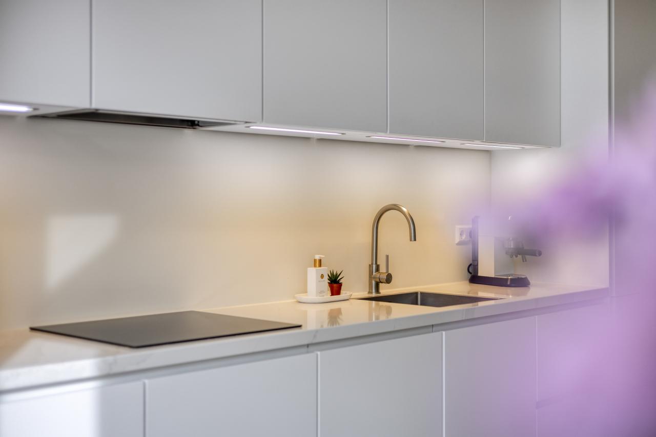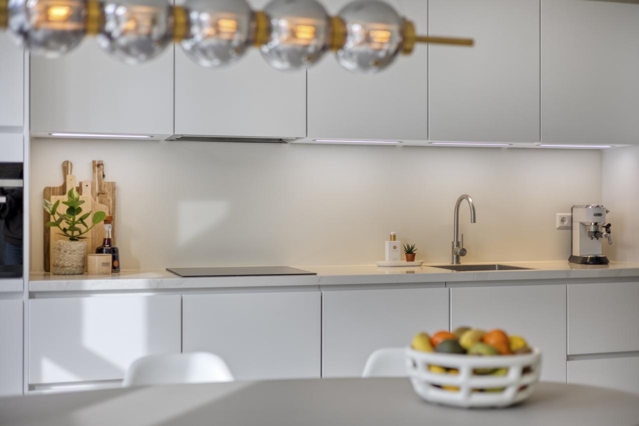 De moderne open keuken is uitgevoerd met luxe inbouwapparatuur en vormt een stijlvol geheel met de woonkamer. Hier leef je met uitzicht op de levendigheid van de Lange Vorststraat, terwijl je binnen geniet van rust en comfort.