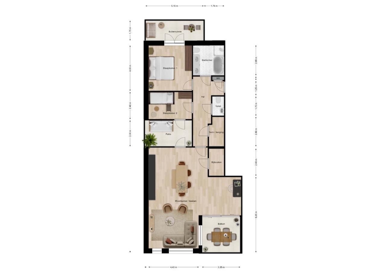 De royale woonkamer van ca. 61 m² met open keuken en berging biedt volop leefruimte. De grote slaapkamer heeft voldoende plek voor eventueel een grote kast. De extra slaap- of werkkamer heeft veel daglicht doordat deze aan de patio grenst. De ruime badkamer is, net als alle andere ruimtes met de praktische hal te bereiken.