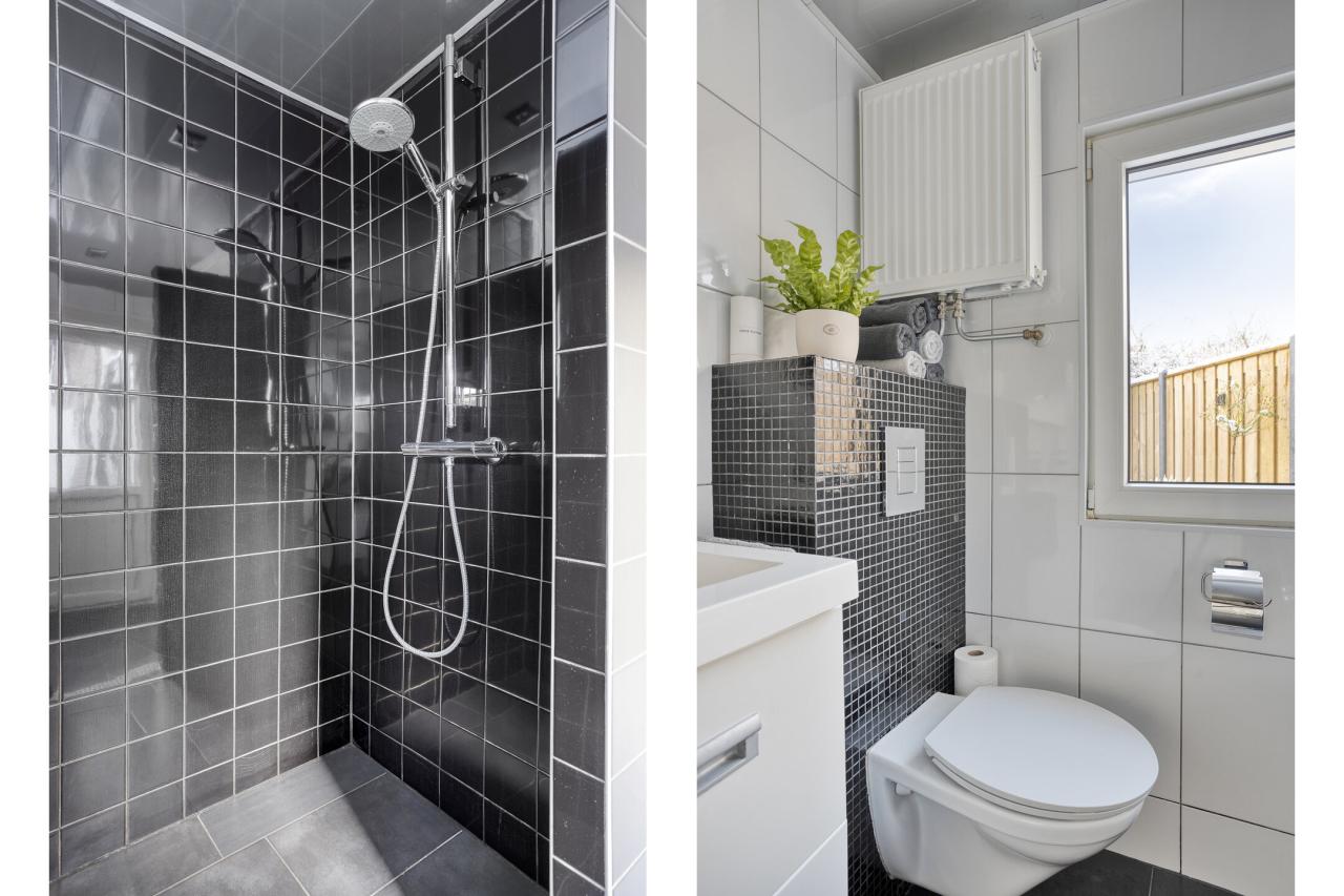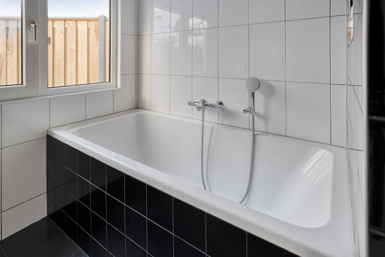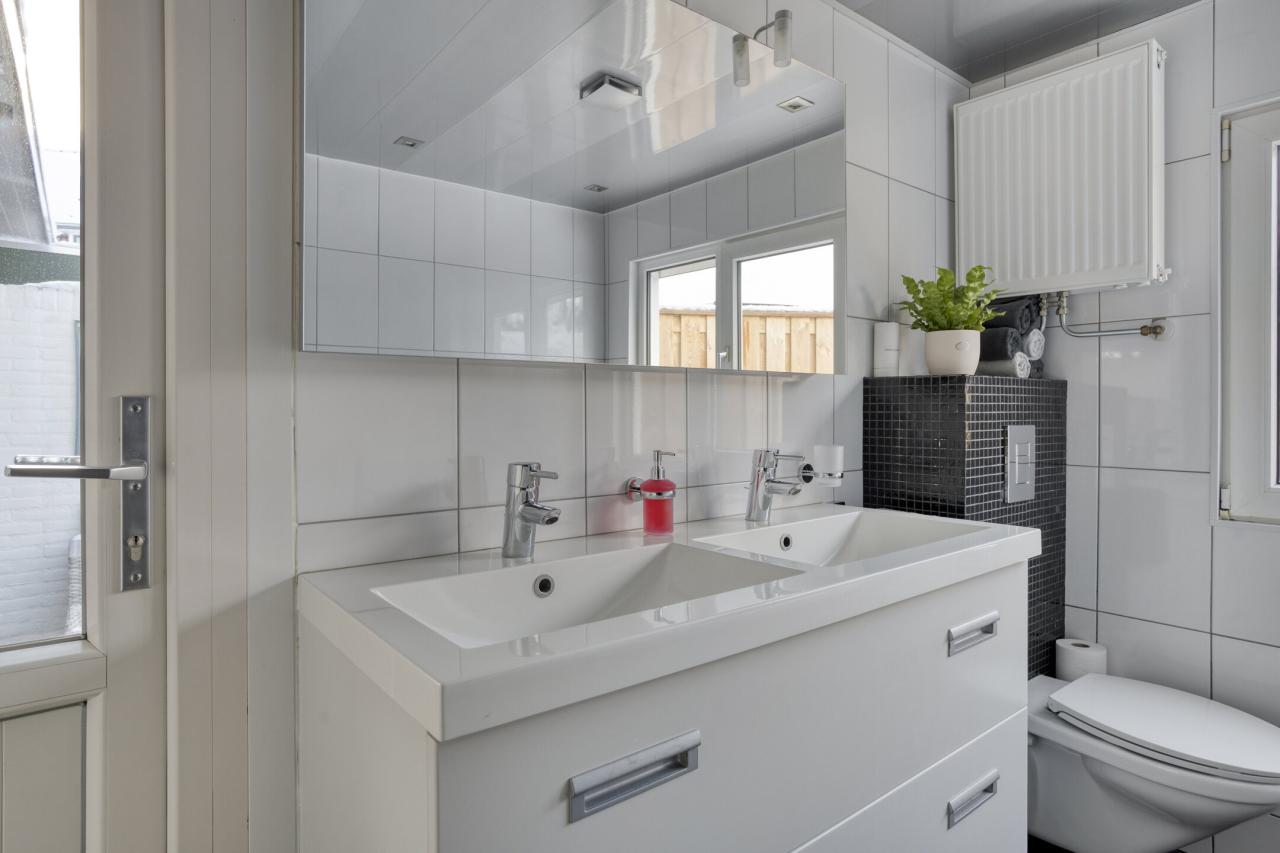 Aansluitend aan de keuken bevindt zich de aanbouw met tuindeur en badkamer. De badkamer is uitgerust met een ligbad, douche, wastafelmeubel en toilet.