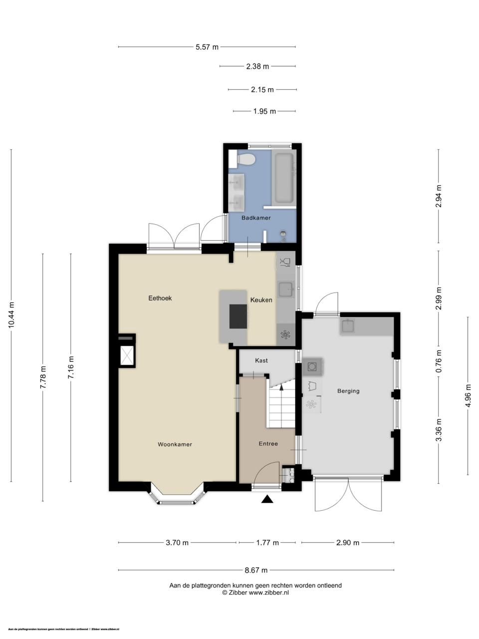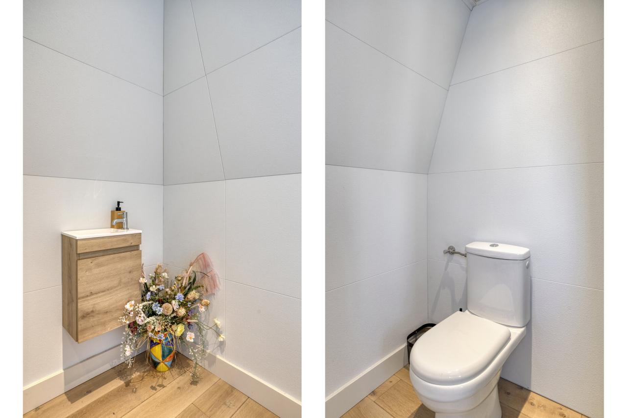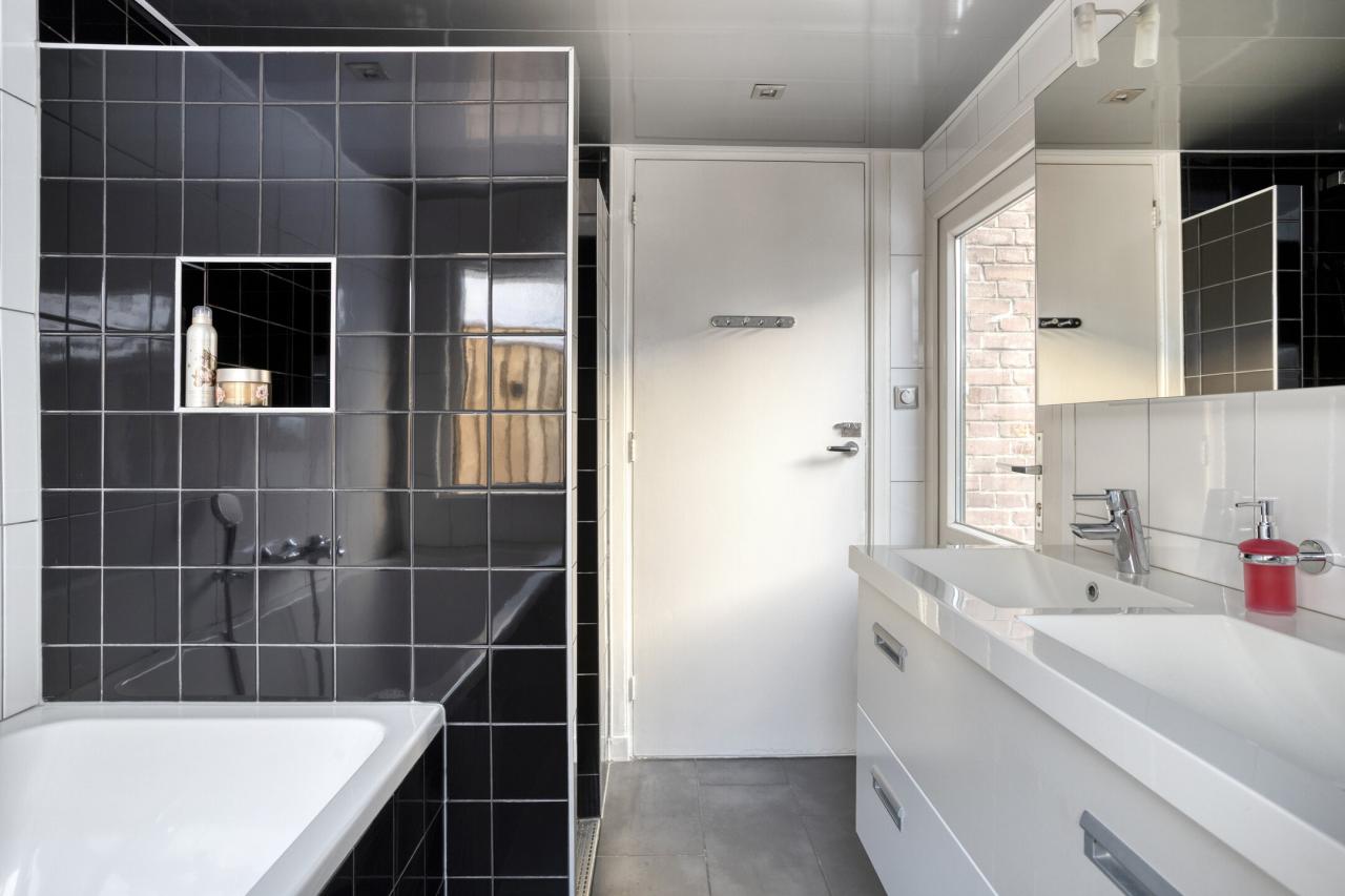 Aansluitend aan de keuken bevindt zich de aanbouw met tuindeur en badkamer. De badkamer is uitgerust met een ligbad, douche, wastafelmeubel en toilet.