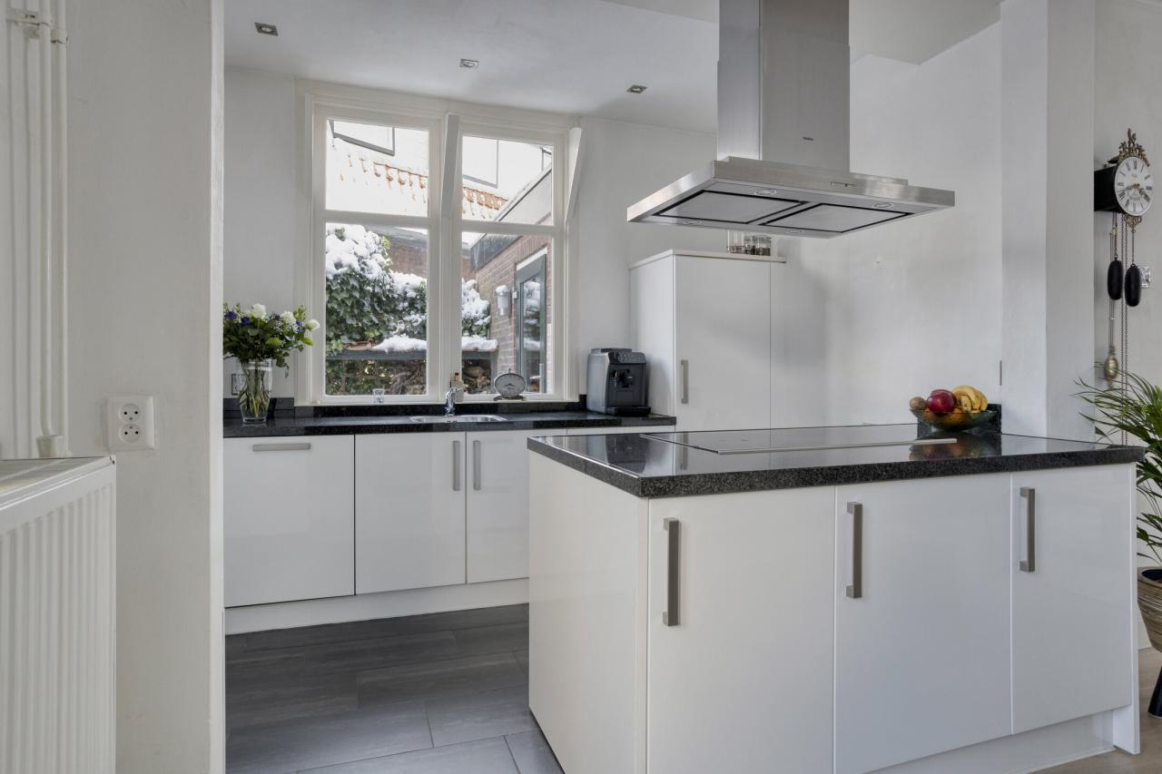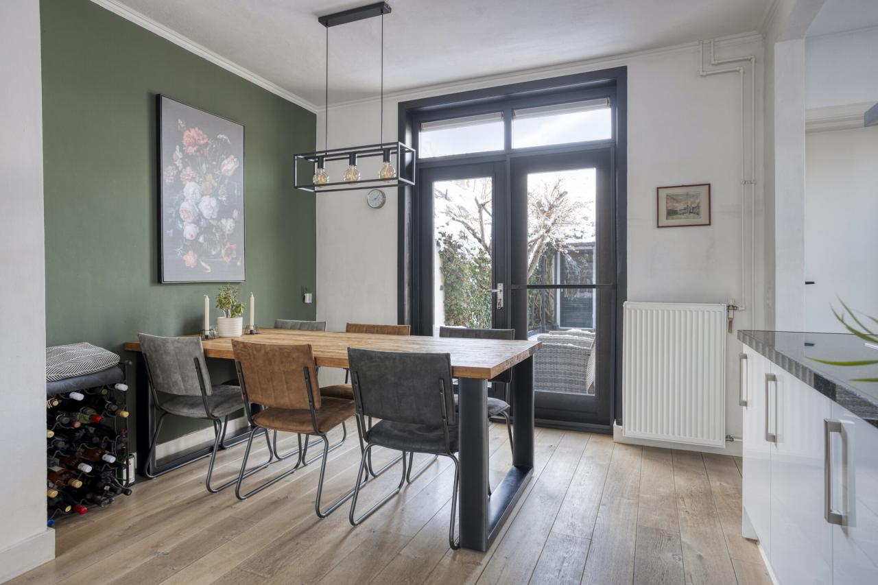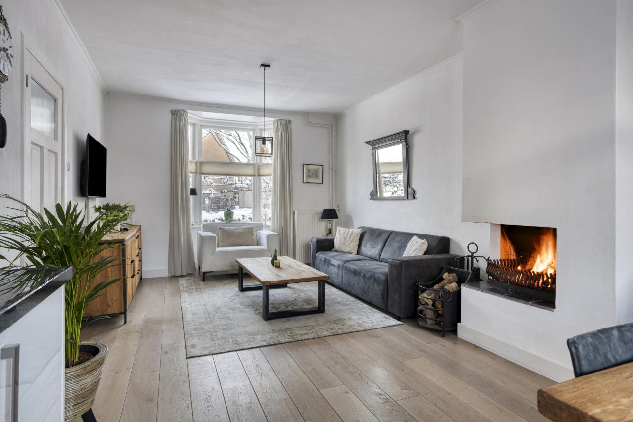 De woonkamer heeft aan de voorzijde een sfeervolle erker met mooie lichtinval en vrij uitzicht op de straat. De ruimte is afgewerkt met een eikenhouten vloer en beschikt over een open haard en openslaande tuindeuren. De eethoek biedt zicht op de tuin en grenst direct aan de open keuken. Het kookeiland vormt een fraaie scheiding tussen keuken en woonkamer. De keuken is voorzien van een vaatwasmachine, oven, afzuigkap, koelkast en inductie kookplaat.