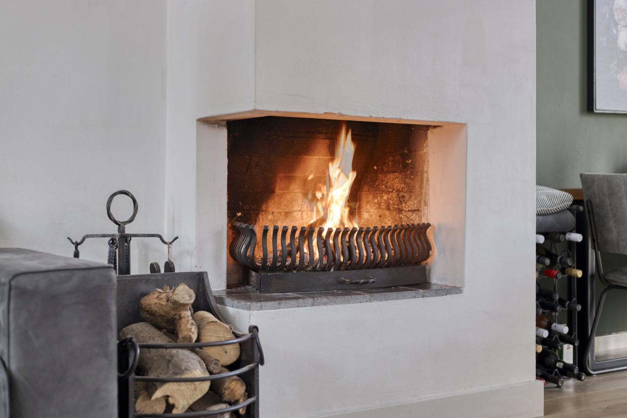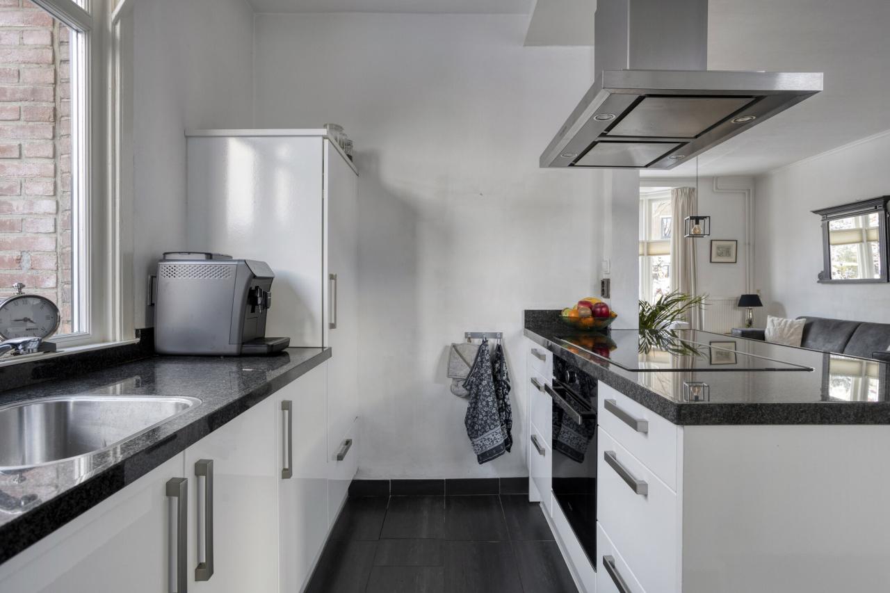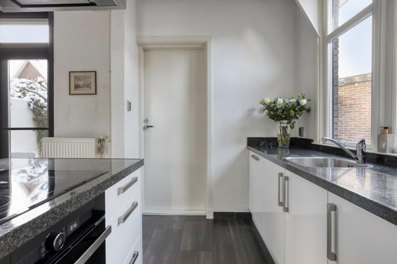 De woonkamer heeft aan de voorzijde een sfeervolle erker met mooie lichtinval en vrij uitzicht op de straat. De ruimte is afgewerkt met een eikenhouten vloer en beschikt over een open haard en openslaande tuindeuren. De eethoek biedt zicht op de tuin en grenst direct aan de open keuken. Het kookeiland vormt een fraaie scheiding tussen keuken en woonkamer. De keuken is voorzien van een vaatwasmachine, oven, afzuigkap, koelkast en inductie kookplaat.