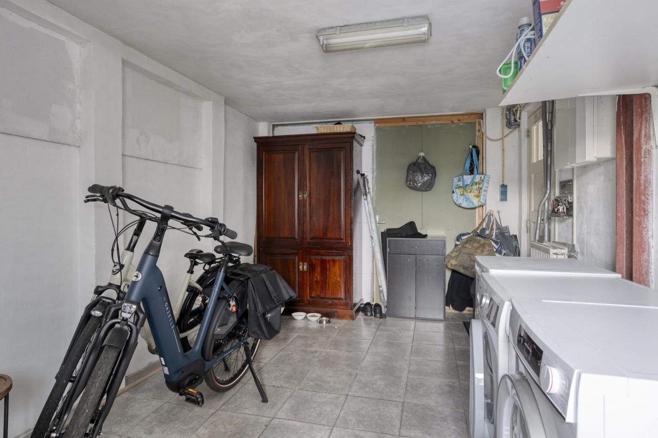 Entree met sfeervolle hal voorzien van trapkast en meterkast. Vanuit de hal is er toegang tot de voormalige garage, die momenteel in gebruik is als berging/bijkeuken. Deze ruimte beschikt over garagedeuren en een achterdeur naar de tuin.