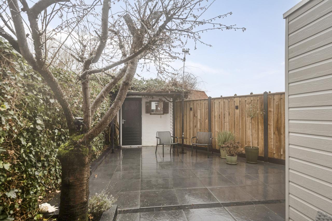 De achtertuin is gelegen op het westen en heeft een goede bezonning. Het betreft een omsloten, sfeervolle en compacte tuin met een vrije achterom. Achter in de tuin bevindt zich een stenen berging.