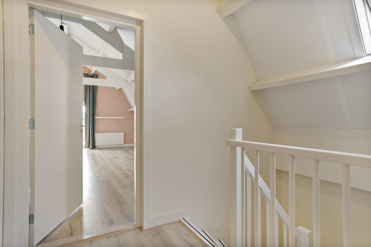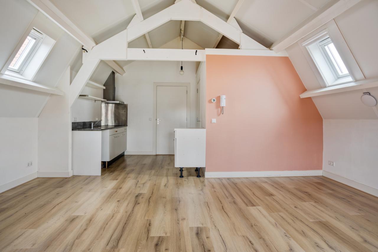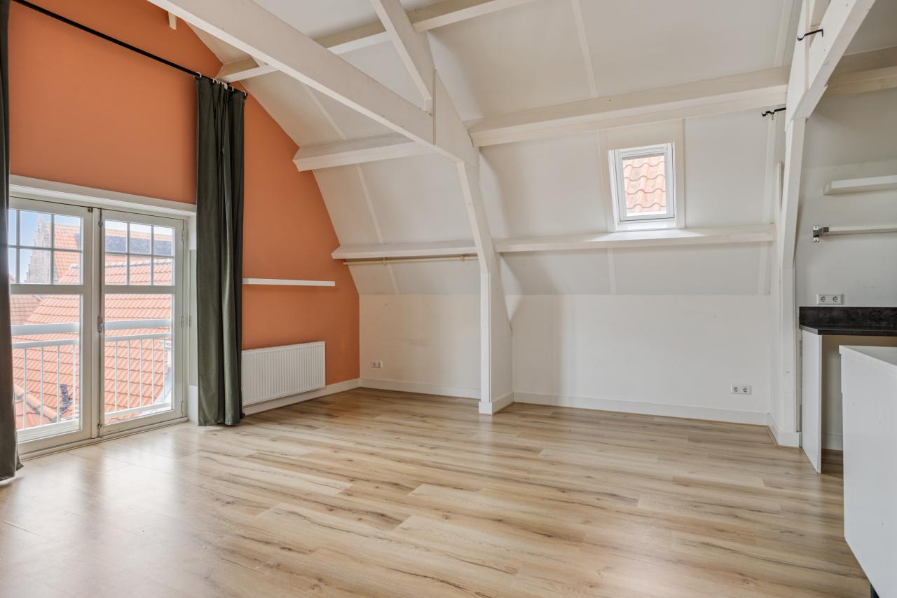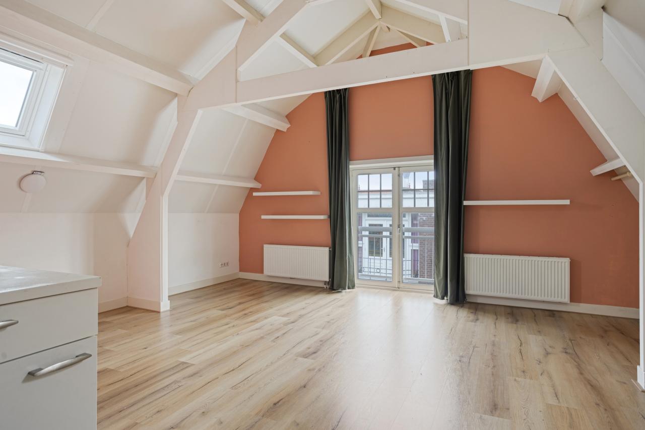 En een woon-slaapkamer met frans balkon aan de voorzijde en 2 dakramen die het een aangenaam lichte ruimte maken.