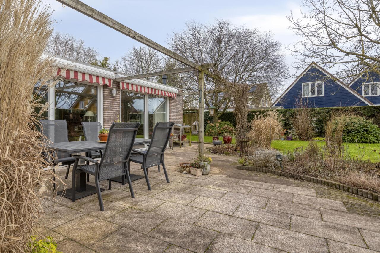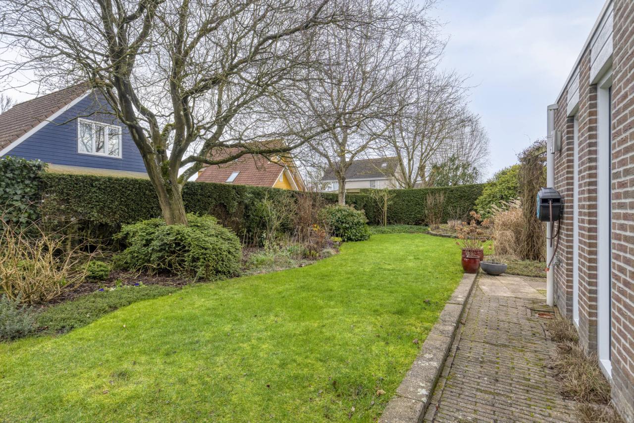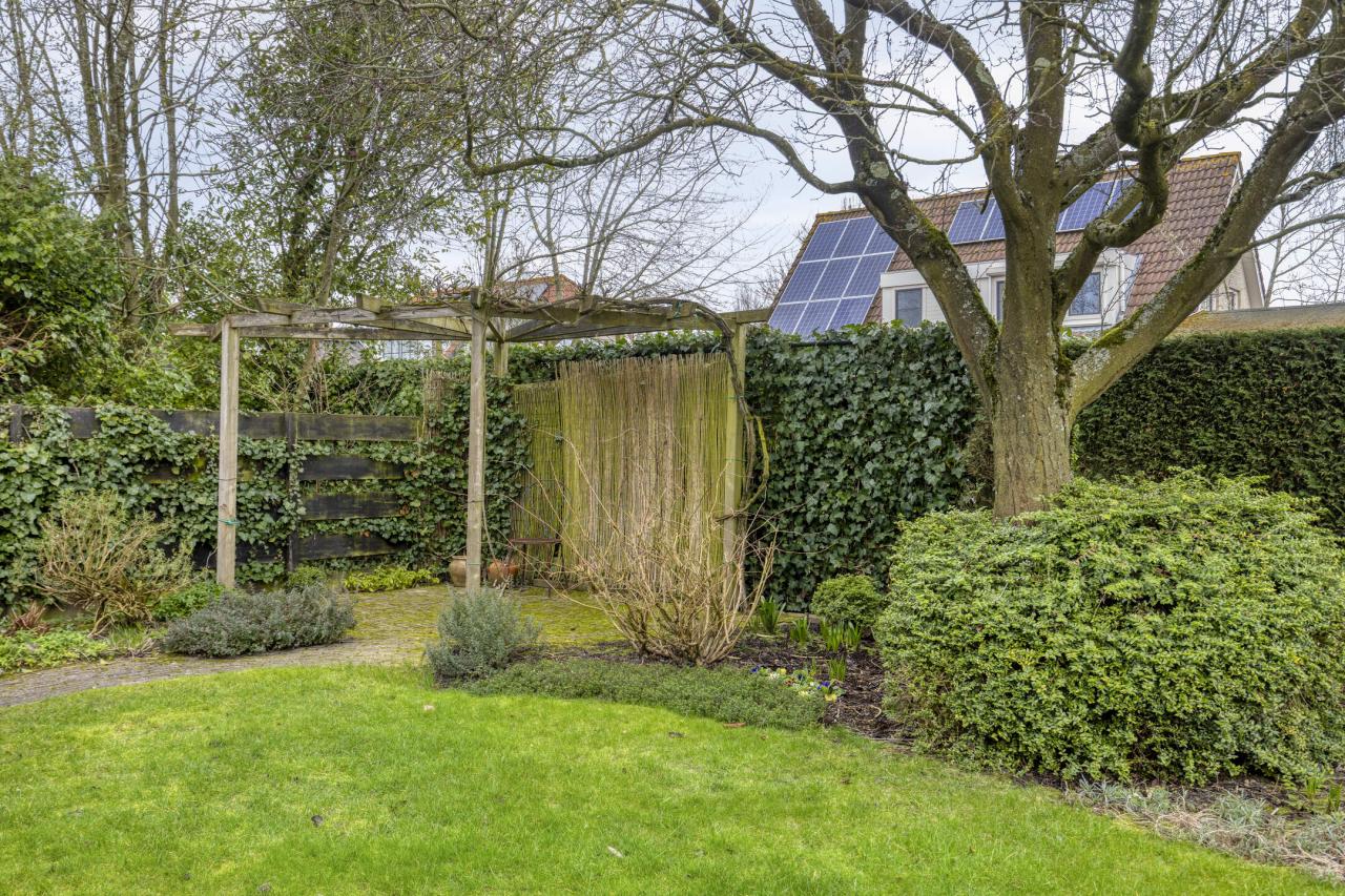 De achtertuin is gelegen op het oosten en heeft een oppervlakte van ca. 110 m². Dankzij de indeling met een royaal terras is er altijd een zonnig of juist schaduwrijk plekje te vinden. De borders met vaste beplanting, groene hagen en een karakteristieke notenboom zorgen voor een sfeervolle en groene uitstraling. In de zomer biedt de boom aangename verkoeling en extra privacy.