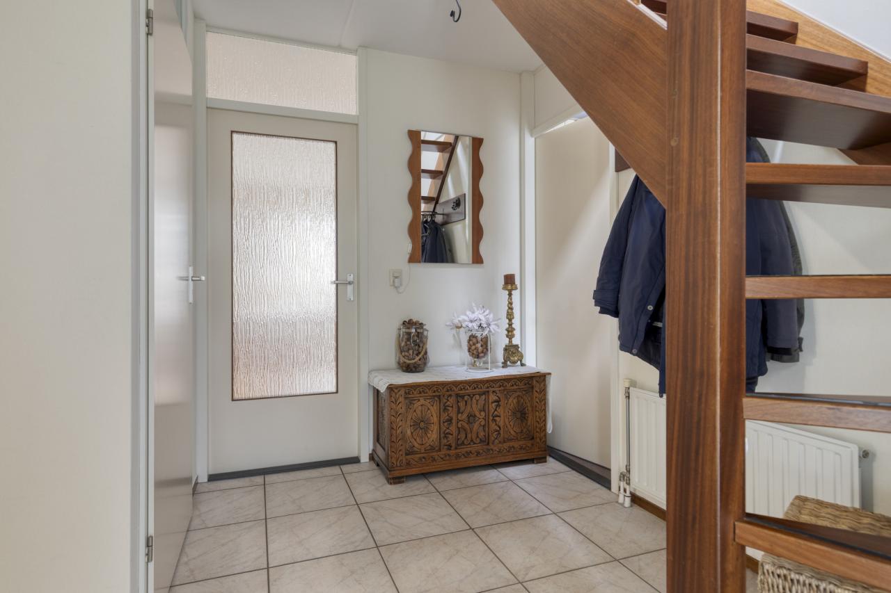 De entree bevindt zich aan de zijkant van de woning. In de hal treft u de meterkast, het toilet met fonteintje en heeft u toegang tot de slaap-/werkkamer (ca. 12 m²), de bijkeuken en de woonkamer.