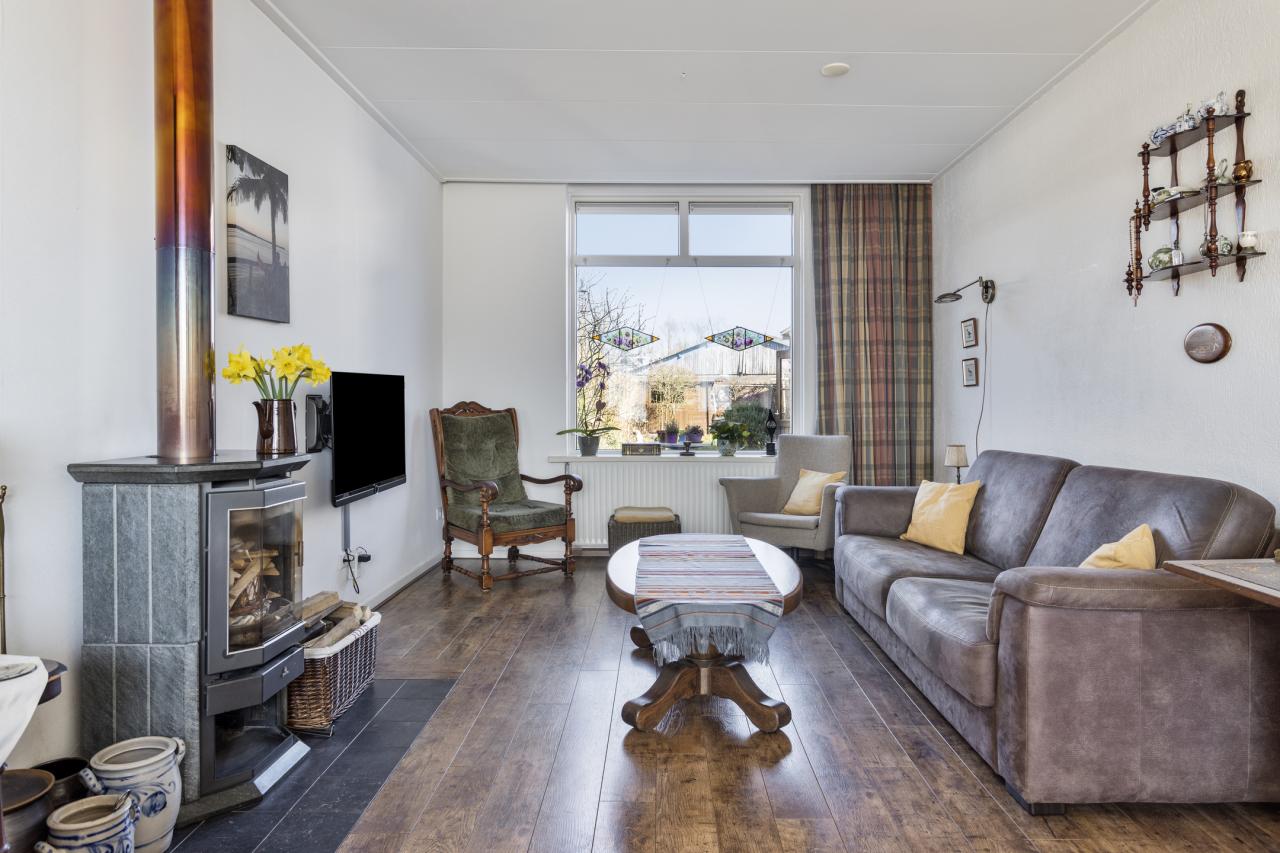 Entree, hal met meterkast, kelderkast, toilet en toegang tot de woonkamer en dichte keuken. De woonkamer is een echte doorzonwoonkamer en is voorzien van een speksteenkachel. Er is veel lichtinval door de grote raampartijen aan de voor- en achterzijde. Aan de achterkant bevindt zich de zithoek en aan de voorzijde is een fijne eethoek gesitueerd. De eenvoudige keuken is voorzien van afzuigkap, koelkast en gasfornuis. Via de keuken komt u in de bijkeuken met wasmachine aansluiting en toegang tot de achtertuin.