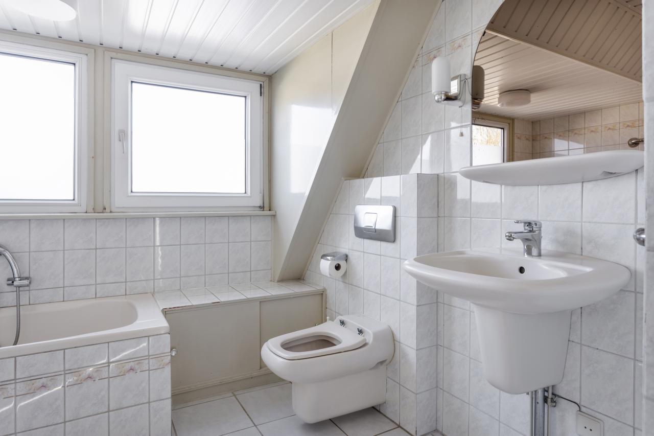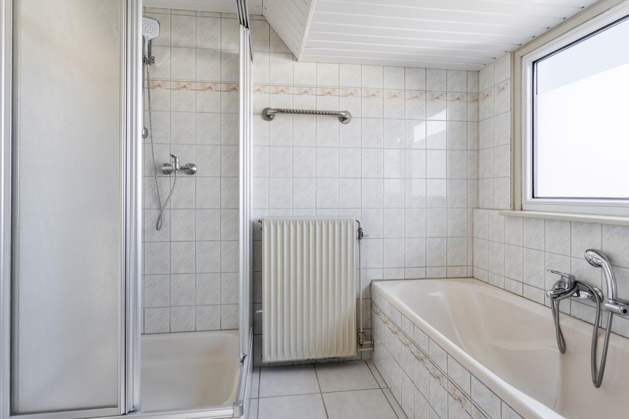 De badkamer is royaal en beschikt over een ligbad, douche, toilet en wastafel.